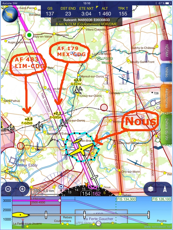 En route nous faisons attention a ne pas interférer avec les trajectoires d'arrivée de Roissy Charles de Gaulle . Nous passons sous mes collègues qui ramènent les Boeing B777 au bercail.
