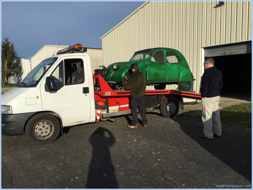Ce matin nous avons rendez-vous assez tôt (pour un samedi) pour que le propriétaire de la 2CV verte qui est hébergée dans le hangar la récupère pour me faire un peu plus de place.