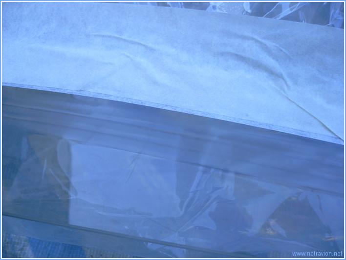 First I reinstall the rear skin and then sand lightly the pop rivet heads on the roll bar as they might scratch the rear window. Then I get the canopy out in the garden, using two old matresses as support. Our lady cat Seraphine (turning 20 in July) checks my moves. First task is to mark the center of the canopy, this will help positionning on the fuselage. Then the first cutting marks are made. The method is as following : a the border of a small tape marks the cutting line, then the protective sheet is taped to the first tape by a larger tape. This is to avoid canopy dust getting between the protective layer and the canopy. The first cut is just to discard the marks left by the tooling i.e the two parallel lines visible in the picture. As it's getting late, the first cut will be for another day. Working time on this subpart Today : 2h (Total : 67h) |