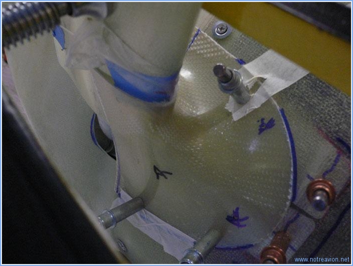 First thing in the afternoon is to tidy up and rearrange the workshop. I could have done it earlier and so I wouldn't have had to redo the levelling and centerline drawing. I fact I took the vetical part of the engine hoist which allowed me to push the engine below the fuselage and center the fuselage in the workshop. This will allow to align the gear leg fairings. The fairing is put back on leg, and the alignement procedure begins. First I mark three positions on the leading edge of the fairing (the blue adhesive). Using a plumb bob the position are marked on the floor and reported on a line perpendicular to the fuse centerline (the red dots). The positions are drawn on a particle board that is placed at the back of the fuselage. Some strings will be used between the position in the back and the one on the fairing. Here the string, the idea being to center the trailing edge of the fairing between the to strings. The small plastic tubing helps being a bit more precise by sliding it from the aft towards the fairing. To be noted that my upper mark was not quite right as the step was interfering with the string. Here the aft part of the intersection fairing. The fit is quite good for those parts I bought from Fairings-Etc. The intersection fairings still have to be cut before being epoxied to the wheel fairing. I still have to install the upper intersection fairing before working on the other side. Working time on this subpart Today : 4h (Total : 40h) |
