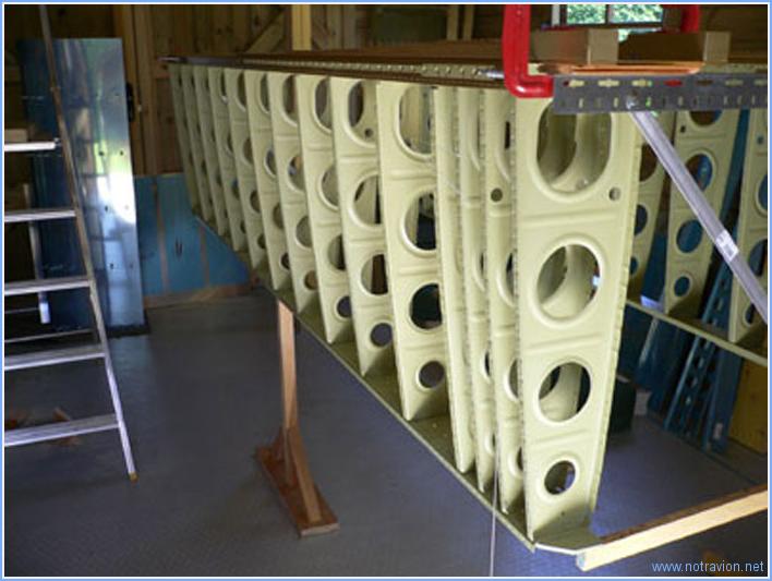 Right wing skeleton assembly. The ribs are first riveted to the main spar working outboard to inboard. Working solo makes some rivets difficult to set. For the most outboard ribs the rivets seem a bit long and have a tendency to tip over, for the left wing I'll cut them a bit shorter. When all the ribs are done, the left spar is riveted by squeezing, you just have to pay attention to the rivet call-out and location. At the end of the day, turning over the skeleton showed a few rivets I'll have to buck a bit more tommorrow. Working time on this subpart Today : 6h (Total : 11h) |