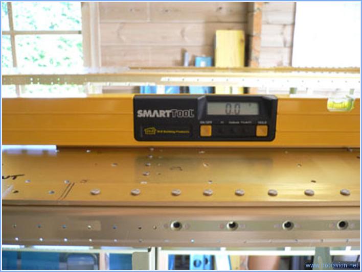 The two assemblies are now clamped to the jig. First I had to make the center support to avoid the 1/2 inch sag of the assembly. To verify that the par is not sagging anymore, you just put a fishning line through the outermost holes of the spar and verify that the line is in the middle of all the holes. The the twist of the wing is verified with two plumb bobs tied to the main spar and then measuring the distance between the string and the rear spar. Once the distance is the same inboard and outboard, the rear spar is clamped down. And here all is clamped down. Then I verified the assembly was horizontal in all directions. Those electronic tools being very precise are sometimes a real pain, the difference between 0° and 0,1° being sometimes impossible to make out by the naked eye. And to finish a fit test of the leading edge and the skins, for the time being all seems to fall into position. Working time on this subpart Today : 3h (Total : 20h) |