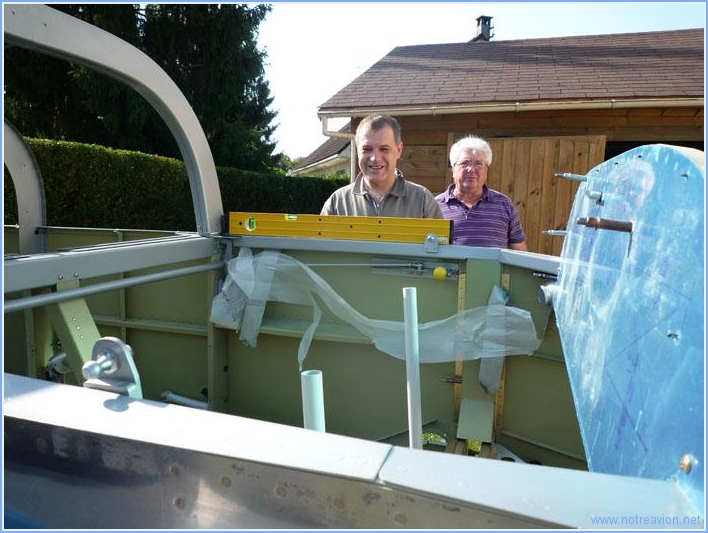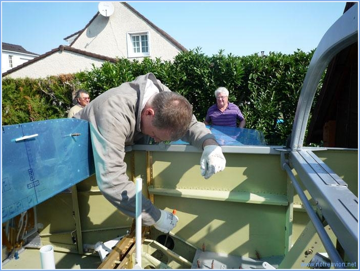 Today was wing mating's day to end with the dreaded rear spar drilling. First we have to get the plane in the garden and level it in all dimension. My neighbour Raymond is my helper. We use shims and play with the tires pressure to get the fuselage straight. Then we get the first wing. The spar and the bolts get greased. Then the forward spar is inserted in it's slot. Some learning was needed to get the right way to do this. What worked for us was the following, insert the spar as far as possible, then wiggle the wing tip to align the holes and insert an upper bolt. Wiggle some more to insert a lower bolt. For the rear spar, it just gets inserted in the fork, fine tuning will be done later. On the picture I use a small mirror to verify if the holes are aligned before inserting a bolt. The is one of the fuel tank brackets, a small bend is needed to get it snug with the bracket on the tank. Here a view of the four installed bolts, two big and two small bolts. The lower bolts are not completely inserted as the landing gear welding is interfering in front of the longeron. My bolts are a bit to long, I'll shorten them for the other wing. This picture shows the rear spar, it's not completely snug because one part of the fork is hitting the innermost wing rib. This will be taken into account for the final fitting. After the second wind is installed, begins the long process of tweaking everything. First the wings have to be perpendicular to the fuselage. For this we took three measurments : from the wing tip to a central point in the rear fuselage, the alignement of four plumb bobs hanging from the leading edge, and the alignement of a rivet line on the wings and the fuse. The two latter showed that the wings were slightly swept forward ay about 3/16" at the tip. We file away 1/32 of the rear spar and of the forward part of the fork (the rear part does not interfere with the wing). The sweep is now zero, so we go on to incidence measuring. Incidence is adjusted by moving the rear spar up and down in the fork. We first check that the fuselage is still straight, then using the block shown in the plans, we check that the level is horizontal. The measurment is done at a few points along the wing span. Both wings are now at the same incidence and the edge distances for the rear spar drilling look good. Then the drilling block is clamped in place (with some difficulties, it's quite cramped) and a small hole drilled. This is the exit hole of the right wing , it looks good leaving enough edge distance. This is the exit hole on the left side. The center of the hole is in the square, but as I file a bit of the fork on the right there might not be enough edge distance if I leave the hole as is. The day having been quite long, we decide to take new measurements tomorrow. If the edge distance proves to small, the solution will be to drag the hole slightly to the left during the drilling to final size which is two and a half time the present size. We have a plane. Almost!! And some happy builders. but let's not forget the photographer, Sabine who gave a hand whenever possible. Working time on this subpart Today : 7h (Total : 35h) |