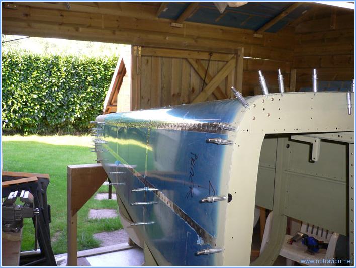 En trois petites heures, entrecoupées de pauses (arrivée de l'étape du Tour de France), nous avons riveté une bonne partie du fuselage arrière : la peau inférieure est terminée ainsi qu'une partie d'une des peaux latérale. Nous avons riveté de façon traditionnelle avec le champignon, mais aussi par rivetage par l'arrière dans certains endroits. Temps de travail sur le sous-ensemble Aujourd'hui : 3h (Total : 45h) |