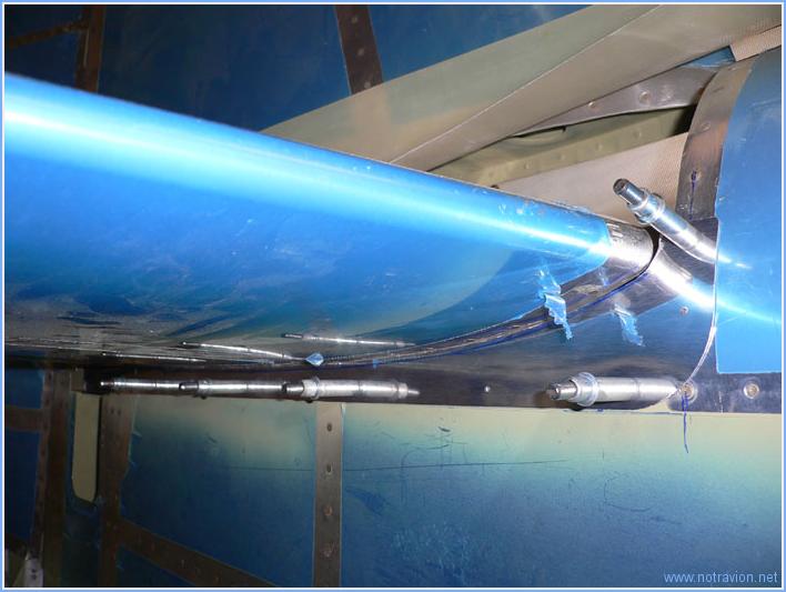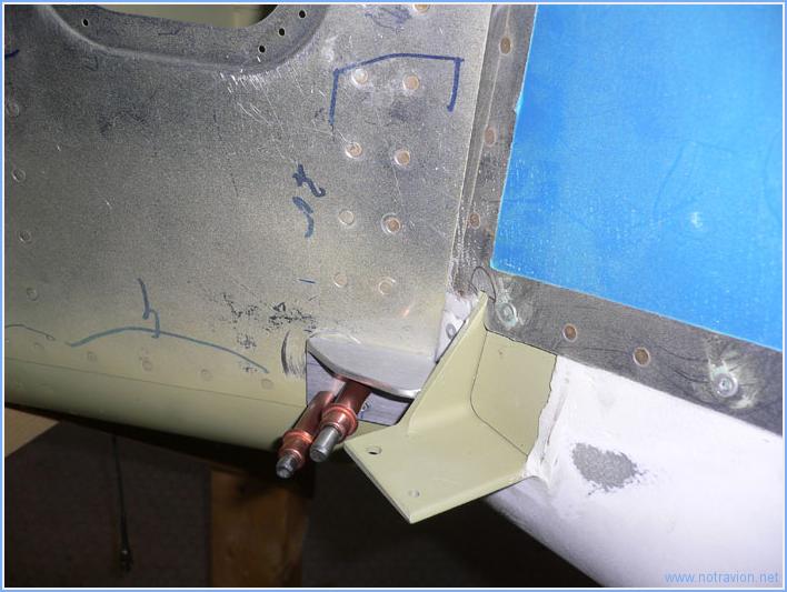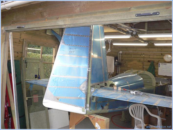 Début de la mise en croix de l'empennage. Cela commence par le réassemblage de la profondeur sur l'établi. L'intrados est sur le dessus, il s'agit de percer les deux cornes de commandes de la profondeur (les deux pièces grisées au centre de la gouverne). Après le perçage d'une des pièces, on utilise un bloc de bois prépercé sur la perceuse à colonne pour faire le deuxième perçage. Le plan fixe horizontal est ensuite fixé sur le fuselage. Tout d'abord le longeron avant, avec le perçage pour les quatres boulons au premier plan sur la photo. Il faut être sà»r pour les deux boulons extérieurs qu'ils soient bien positionnés sur la plan fixe mais aussi sur les longerons le long du fuselage. Les quatres boulons extérieurs visibles au second plan sont plus simples à positionner car les pièces sur le fuselage sont déjà prépercées. Puis, mise en place du plan fixe vertical. Comme pour le plan fixe horizontal il faut pas plusieurs montages, démontages et prises de mesures avant d'obtenir un positionnement correct. Puis vient la mise en place de la butée de profondeur puisque le plan fixe vertical est fixé dessus. Voici la fixation du longeron avant du plan fixe vertical, il reste les perçages à faire. Temps de travail sur le sous-ensemble Aujourd'hui : 5h (Total : 57h) |