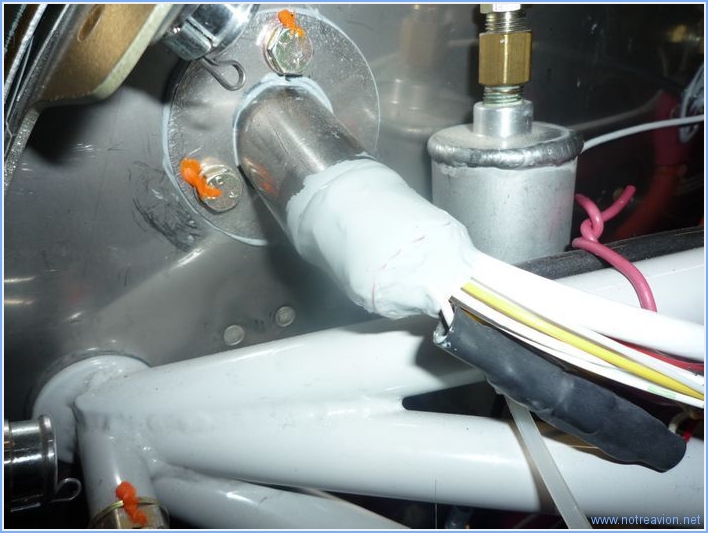 La commande de mixture ou richesse a été installée, voici le montage sur le bloc d'injection. J'ai rajouté une rondelle pour que le jeu entre la rotule et le bras de commande soit un peu plus grand. Il me reste à vérifier si le boulon est monté dans le bon sens, il me semble avoir vu une discussion à ce sujet sur Vansairforce. Et voici le passage à travers la cloison pare-feu. j'ai eu un petit souci car j'avais percé la rotule au diamètre de la commande fournie par Vans, hors la nouvelle commande est un peu moins large car elle n'est pas entourée par une gaine de protection. Pour le moment j'ai juste installé un morceau d'adhésif mais il faudra arranger cela lors des réglages définitifs. J'ai également mis en place les tubes de ventilation. Voici celui pour la pompe carburant qui est fixé sur le carénage de la pompe avec une goupille fendue. Voici le coté moteur avec une goupille fendue installée à droite. Le tube coté gauche va ventiler la magnéto gauche, il sera fixé un peu plus tard avec une goupille, si j'en trouve, sinon avec du mastic. Temps de travail sur le sous-ensemble Aujourd'hui : 2h (Total : 166h) |