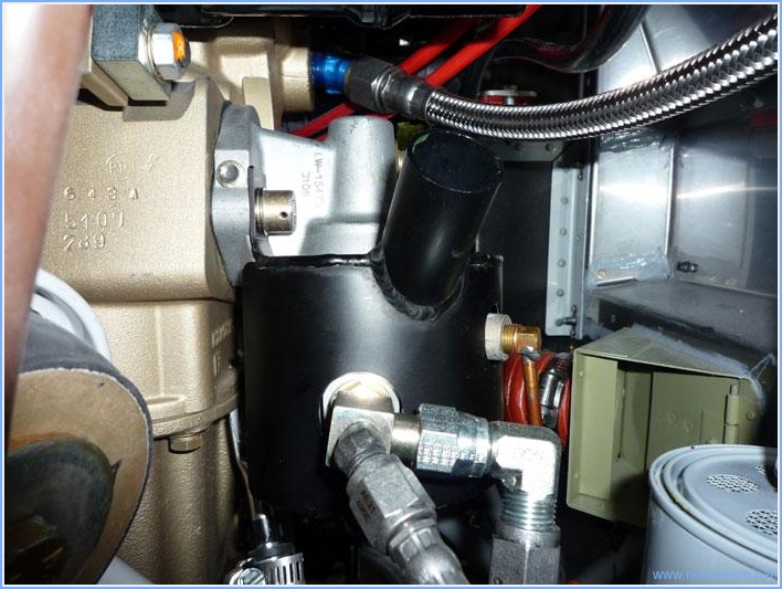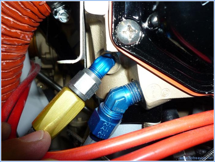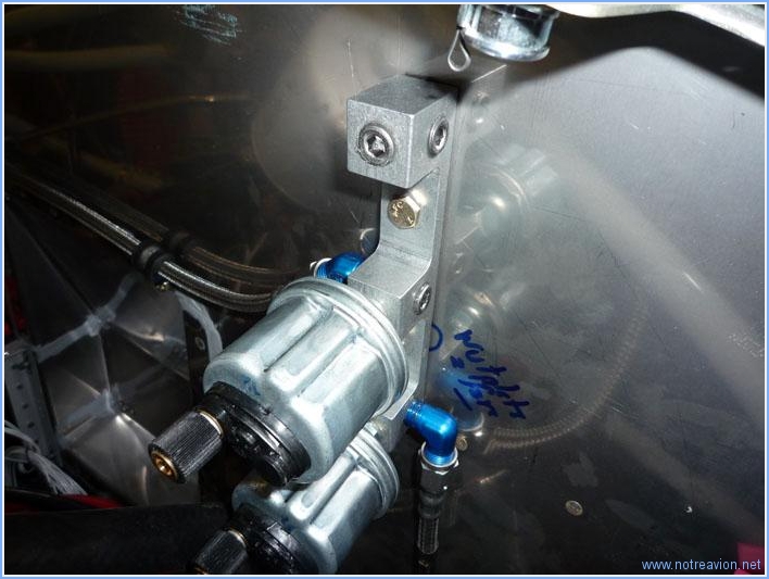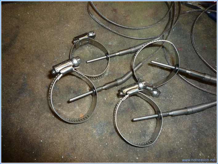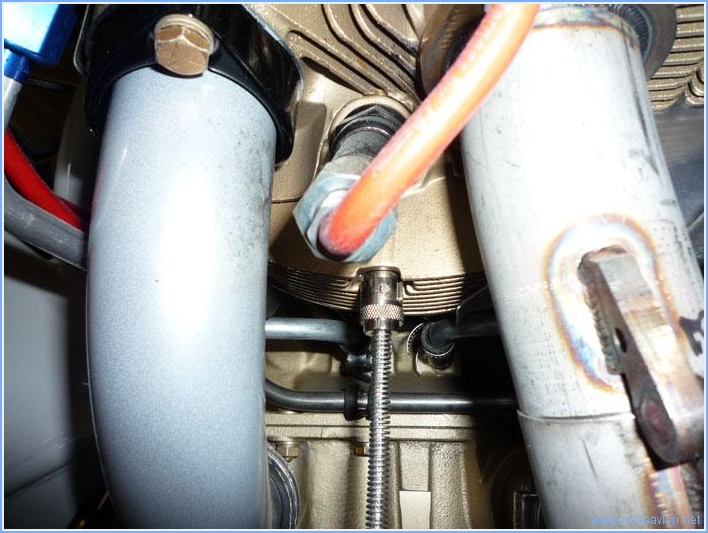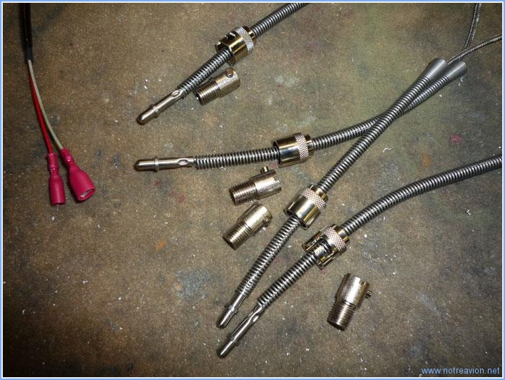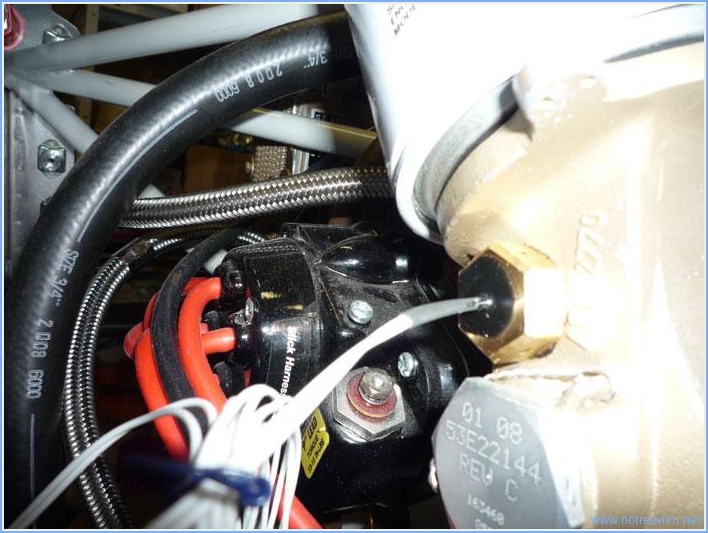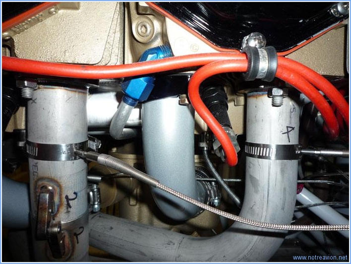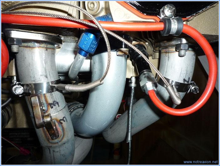 Comme je suppose que l'espace entre l'arrière du moteur et la cloison pare-feu sera assez chaud suite à l'installation des deux silencieux, je préfère protéger un peu mieux la pompe mécanique carburant et éviter ainsi tout risque de cavitation (vapor-lock). Le sites internet consultés considèrent cette opération assez délicate car l'accès à la pompe et à ses boulons de fixation n'est pas aisée. à?tant prévenu, l'opération s'avère faisable. La photo montre le carénage noir en place. Il faudra que je rédémonte le tout car il faut remplacer le joint entre la pompe et le bloc moteur. J'ai pris récemment livraison de tous les capteurs moteurs. Il faut donc commencer à les installer. Cela commence par la sonde de température d'huile qui vient se visser sous le filtre à huile, c'est le boulon du haut avec le cablâge Puis, c'est au tour des sondes de température des têtes de cylindre. Un support est à visser dans le cylindre, sous la bougie inférieure et la sonde vient ensuite se fixer par quart de tour sur le support. La photo montre les quatre sondes ainsi que les quatre supports. Voici une des sondes installée. Ensuite, un peu plus délicat à installer, les sondes de température des gaz d'échappement. Elles sont à positionner sur les pipes d'échappement entre 5 et 20 cm du cylindre sur une portion rectiligne. Et cette distance doit être la même pour les quatre cylindres. Voici l'installation sur les cylindres 1 et 3, du coté droit de l'avion. Les sondes sont à 6 cm du cylindre, sur le cylindre 1 c'est dans une portion courbe mais il n'a pas été possible de faire autrement. Si on met les sondes plus loin du cylindre, il faute descendre sous le raccord qui est sur le cylindre à gauche sous la sonde. Mais dans ce cas on est en plein sur le raccord d'un des cylindres de l'autre coté. Il faut aussi positionner les sondes de telle manière que les bougies restent accessibles pour la maintenance. De l'autre coté, il n'y a aucun problème avec la distance choisie. Ensuite j'installe le raccord et la tuyauterie de prise de pression d'admission. Il faudra que je modifie le raccord pour en restreindre le diamètre pour éviter des fluctuations importantes de la valeur mesurée. Voici l'autre extrémité du tuyau précédent. Il faudra faire également des modifications car j'ai besoin de deux sorties : une pour les instruments de bord et l'autre pour l'allumage électronique. Temps de travail sur le sous-ensemble Aujourd'hui : 4h (Total : 131h) |