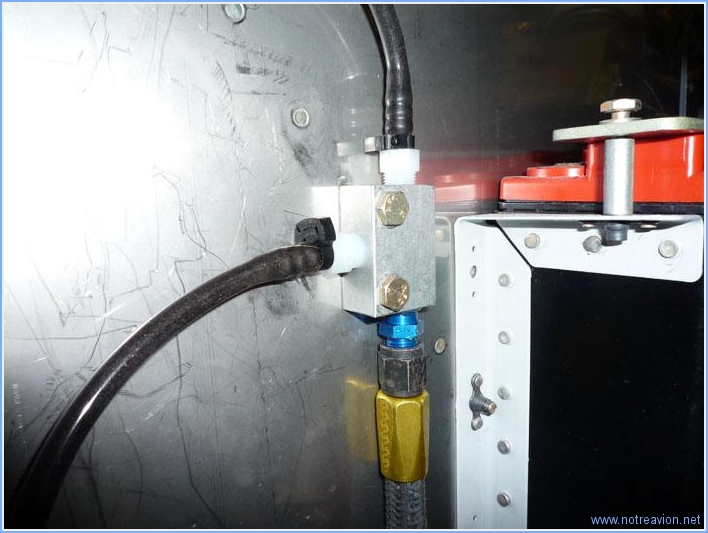 J'ai initialement commencé par vouloir changer le joint de la pompe carburant mécanique pour m'apercevoir après démontage que j'avais commandé la mauvaise pièce. J'ai donc continué l'installation des différents capteurs. Voici le collecteur qui reçoit en bas la pression d'essence et au centre la pression d'huile. Pour l'instant la position supérieure est en attente. J'ai ensuite modifié un raccord pour restreindre le passage au niveau de la prise la pression d'admission. J'ai utilisé le corps d'un rivet adapté à l'ouverture du raccord et collé à l'epoxy. Après séchage, j'ai percé un trou de 1mm. Cela devrait suffire à éviter les fluctuations de la pression d'admission et une fuite trop grand en cas de problème sur la ligne de mesure. Comme j'ai besoin de la pression d'admission pour l'allumage électronique et pour l'instrumentation, il faut installer un T dans le circuit. J'utilise un petit collecteur à trois entrées qui est boulonné sur la cloison pare-feu. La fixation bien que simple prend pas mal de temps pour le perçage, l'ébavurage, le fraisage et le rivetage des écrous prisonniers. J'ai également commencé à voir comment ranger tous les éléments en avant de la cloison pare-feu : les câblages, les différents tuyaux et conduites. Temps de travail sur le sous-ensemble Aujourd'hui : 4h (Total : 135h) |
