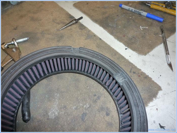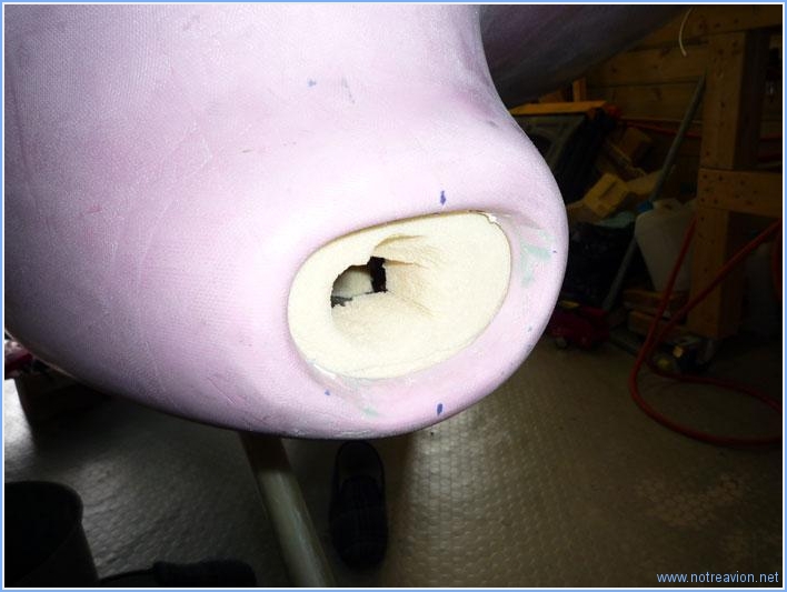 Le bloc de mousse étant bien fixé dans l'écope, il s'agit de faire la découpe pour que l'ouverture s'adapte à la boite du filtre à air. Voici le début de la découpe. Voici la découpe terminée, on peut voir sur la photo que le bloc de mousse ne va pas tout à fait jusqu'à la boite. Ceci n'est pas vraiment un problème, mais j'en ai rencontré lors du ponçage de finition. La mousse est très friable et il suffit d'un appui un peu trop prononcé pour poncer trop profondément. C'est ce qui est finalement arrivé, j'ai donc installé un nouveau bloc de mousse et me voilà rendu à la case départ. Temps de travail sur le sous-ensemble Aujourd'hui : 1h (Total : 94h) |