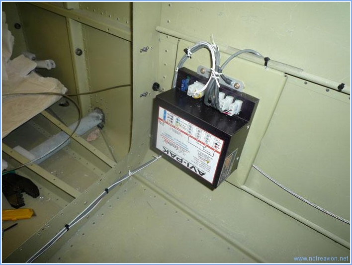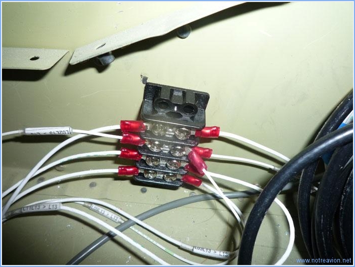 Il a fallu presque trois heures pour mettre au propre les connexions sur la boite d'alimentation des strobes. Il y a les différentes cosses et prises à installer, puis il faut mettre à la masse les blindages des câbles d'alimentation des ampoules (les blindage des câbles gris sont reliés à la vis de fixation en haut à droite). Puis il faut fabriquer si possible un harnais correct qui chemine sans interférer avec le câble de commande de la gouverne de direction. Temps de travail sur le sous-ensemble Aujourd'hui : 3h (Total : 80h) |