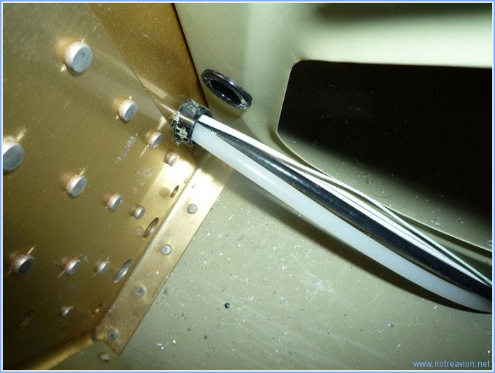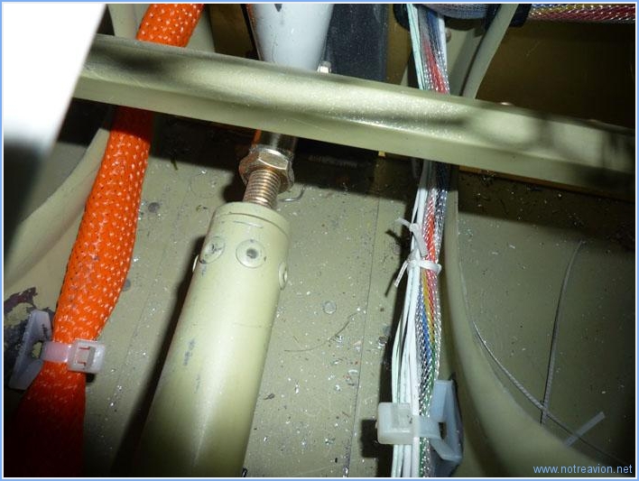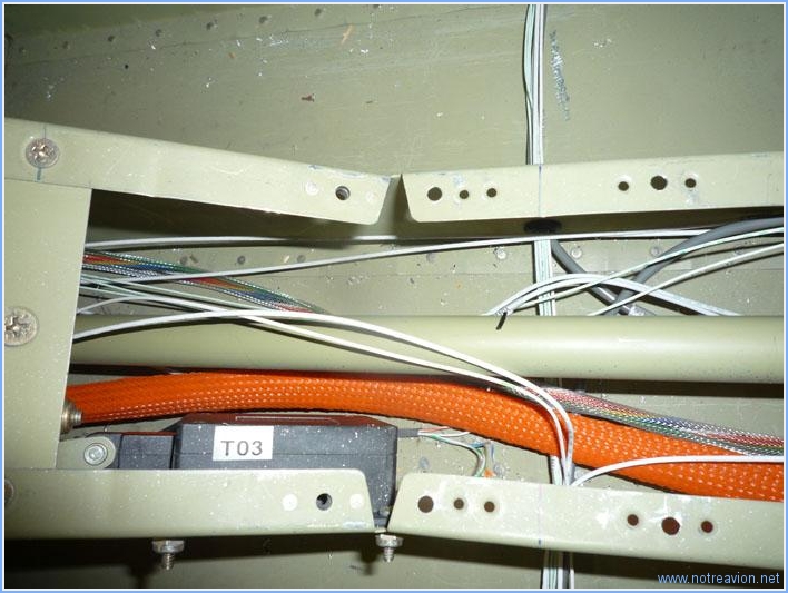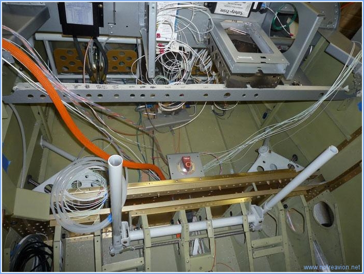 Suite du câblage, avec l'installation des câbles passant sous les sièges. Je commence par les câbles des feux de navigation et des phares qui sont tous rassemblés sur un domino sous le siège gauche. Sur ce même coté gauche, je vérifie le passage au niveau du cadre principal, il y a là l'antenne NAV, les câbles des phares, la tuyauterie du tube pitot et il reste encore 8 petits câbles à passer pour les commandes au niveau du manche de gauche. Le tunnel central commence à être également bien encombré après le passage des câbles pour les volets : commande moteur et capteur de position. Il reste à passer au centre les câbles pour la servo-commande du trim d'aileron. Temps de travail sur le sous-ensemble Aujourd'hui : 4h (Total : 73h) |
