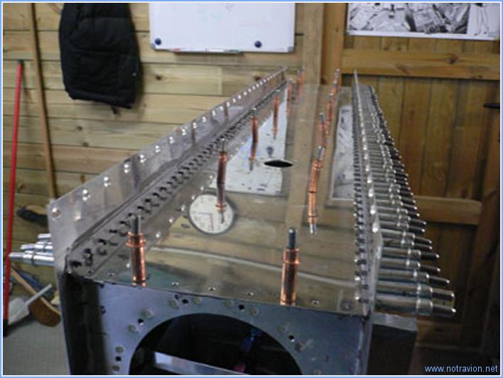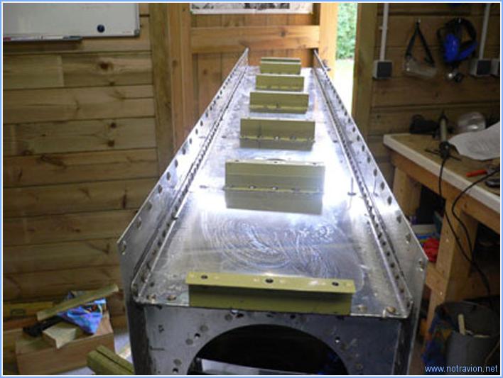 Début de la fermeture du réservoir gauche. Ce n'est pas très compliqué, mais très long. Voici la photo avec la paroi arrière en place. Cela fera un paquet de pince à nettoyer. Voici la photo quatre heures plus tard après rivetage. Les supports en Z sont fixés avec des rivets pop. Il vaut mieux vérifier deux fois l'orientation des supports ils serait assez délicat de la démonter. Pour ce réservoir, il reste à mettre en place le jaugeur et le couvercle de la trappe de visite. Temps de travail sur le sous-ensemble Aujourd'hui : 4h (Total : 76h) |