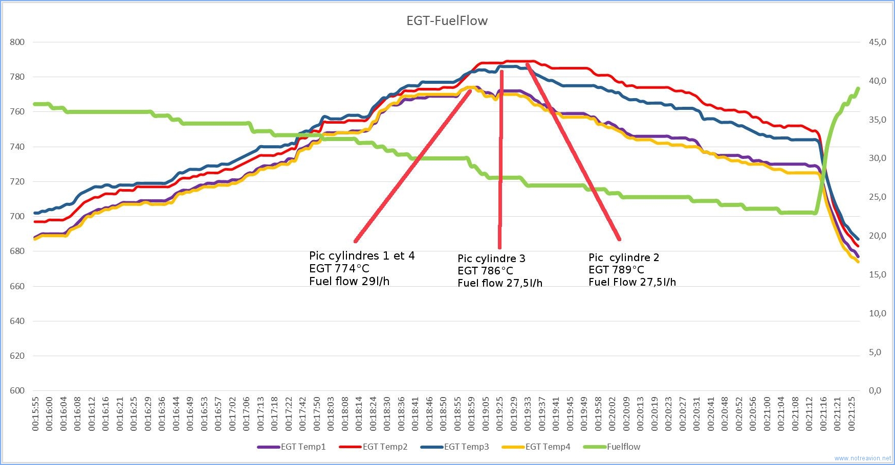 La richesse du mélange est progressivement diminuée (la courbe verte indique le débit carburant). Les EGT augmentent lentement jusqu'à atteindre un pic, le test est considéré concluant si l'écart entre le débit lié au premier pic (cylindre 1 et 4 dans mon cas) et le débit lié au dernier pic (cylindre 2) est inférieur à 2 litres/heure.