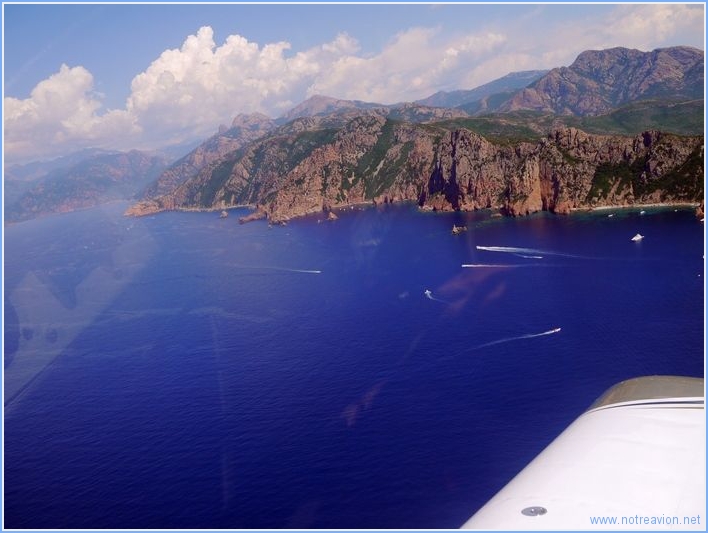 Sur le chemin du retour vers Calvi nous traversons le Golfe  d'Ajaccio, survolons les îles Sanguinaires, passons au large de Cargèse, faisons un petit détour par les calanques de Piana tout en évitant de survoler la réserve naturelle de Scandola.