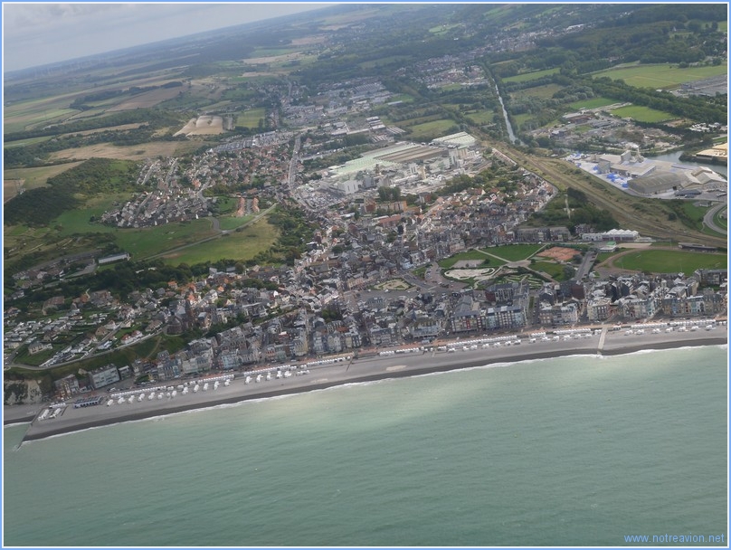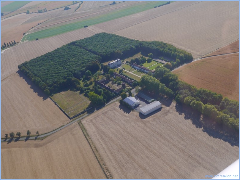 Puis nous survolons la côte avec initialement Le Tréport. On note sur la droite pénétrant la falaise, le funiculaire qui permet un accès au sommet. Ce funiculaire est assez original il possède quatre cabines indépendantes qui fonctionnent en fait comme des ascenseurs. Puis après avoir traversé la Bresle, nous passons au large de la commune voisine, Mers-les-bains. Et nous voilà au-dessus du terrain d'Eu-Mers-Le Tréport, nous atterrissons en piste 23 avec un assez fort vent d'ouest. Si la fiche de terrain avertit de risque de turbulences lors de l'atterrissage en 05, avec le vent du jour, l'atterrissage en 23 est également un peu chahuté avec du gradient de vent en courte finale. Avis aux futurs utilisateurs. Une fois sur place nous visitons Le Tréport et notamment les façades colorées de Mers-les-Bains. Au départ, nous survolons le site de fouilles de Briga, une ancienne cité gallo-romaine. En arrivant près de Nangis nous survolons ce chateau. En regardant de plus près je note que nous empruntons souvent la route qui passe devant le domaine mais n'avions jamais vu cet ensemble. Il s'agit du Chateau de Champgueffier.