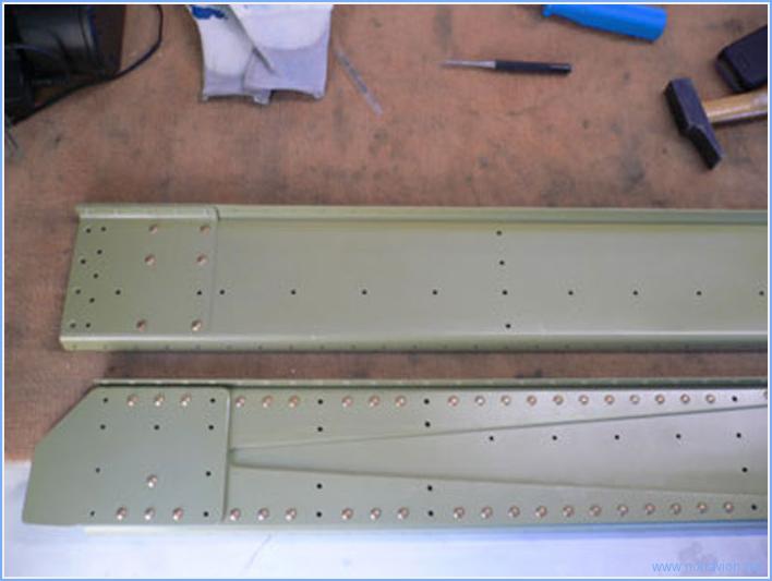 Assemblage et rivetage du longeron arrière, j'ai perdu un peu de temps car j'ai du redémonter les petits renforts (11 rivets à enlever par longeron) ayant oublié d'embréver les bords!!! Sur la photo il semble manquer des rivets sur les plaques de renfort, c'est normal c'est les perçages pour la fixation des nervures. Temps de travail sur le sous-ensemble Aujourd'hui : 2h (Total : 5h) |