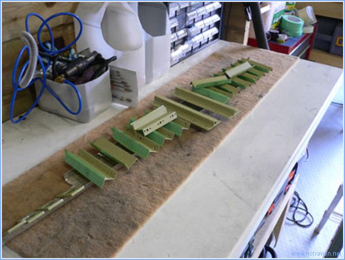 Passage des supports en Z au primaire et montage d'un des supports pour voir. Il est normal qu'une partie du support ne soit pas peinte, c'est cette partie qui sera en contact avec le fond du réservoir et elle va recevoir du mastic d'étancheité qui ne fait pas bon ménage avec le primaire. Temps de travail sur le sous-ensemble Aujourd'hui : 1h (Total : 14h) |