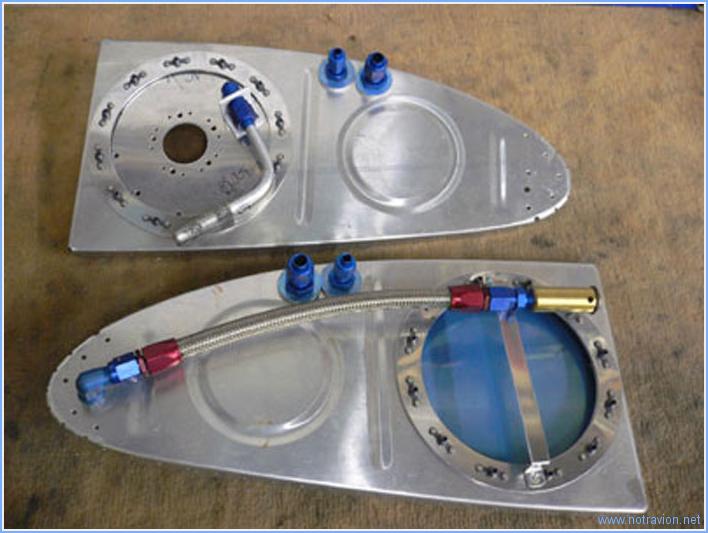 Encore des petits travaux de préparation des réservoirs. Pose des écrous prisonniers de la trappe de visite, perçage des passages de la mise à l'air libre et de la tuyauterie de retour carburant (pas nécessaire pour l'instant) et préparation du montage des jaugeurs. Il reste à poser les bouchons de réservoir, les drains et le jaugeur du réservoir gauche. Temps de travail sur le sous-ensemble Aujourd'hui : 3h (Total : 33h) |