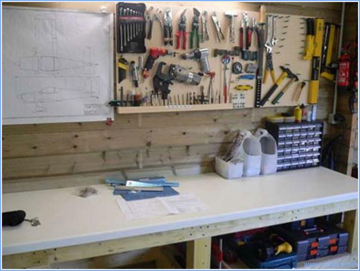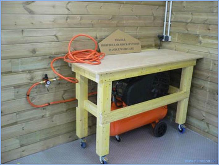 Depuis aujourd'hui, l'atelier est opérationnel. L'électricité fonctionne, les établis sont construits et le rangement est terminés. La plupart des pièces sont stockées dans un plafond créé au dessus de l'atelier.Voici le coin compresseur. Ce dernier est surmonté d'un établi mobile de 1,50 x 0,60m. Sur l'établi j'ai gardé l'inscription du carton de livraison de chez Van's. Voici un autre coin de l'atelier, de quoi ranger un peu ainsi qu'un autre établi mobile qui sert de support à la perceuse à colonne, au touret à meuler, à la scie à ruban et à un étau. Voici enfin le dernier établi (fixe) avec le rangement de l'outillage et des petites pièces. Sur l'établi les composants du kit d'entrainement de Van's, ce sera la prochaine tâche. |