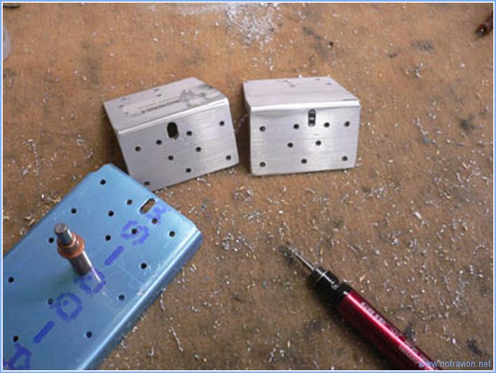 Suite de la fabrication du cadre des sièges. Sur le dessus du cadre viennent se fixer un angle et une petite bande métallique à plier qui permettront d'avoir deux positions pour le dossier des sièges. Il faut tout d'abord fixer l'angle avec un écartement de 1/8 de pouce avec le haut du cadre, j'utilise deux forets de 1/8 pour maintenir l'écartement. Ensuite il faut plier de 4° la plaque, je fais cela au marteau en serrant la plaque entre deux morceaux de bois. Pour obtenir un résultat satisfaisant j'ai été obligé d'y revenir plusieurs fois. Voici la partie supérieure du cadre avec les morceaux des dossiers dans les deux positions possibles. J'ai ensuite terminé les angles commencés la dernière fois, il faut les percer en postion et ensuite reporter le perçage en ovale. Pour faire ce perçage, j'ai d'abord percé deux trous aux extrémités, avant d'égaliser le tout avec une petite fraise. Voici le cadre monté provisoirement, il reste à faire les fraisages pour les rivets à tête fraisée et à ébavurer tout cela. Temps de travail sur le sous-ensemble Aujourd'hui : 4h (Total : 24h) |