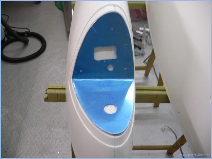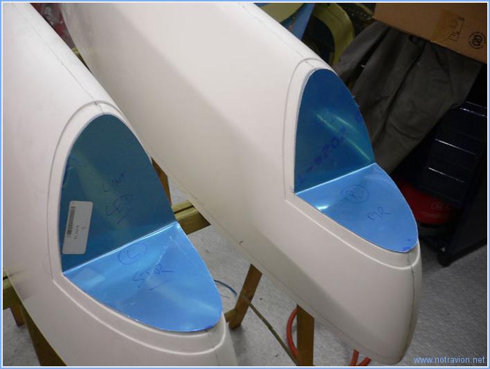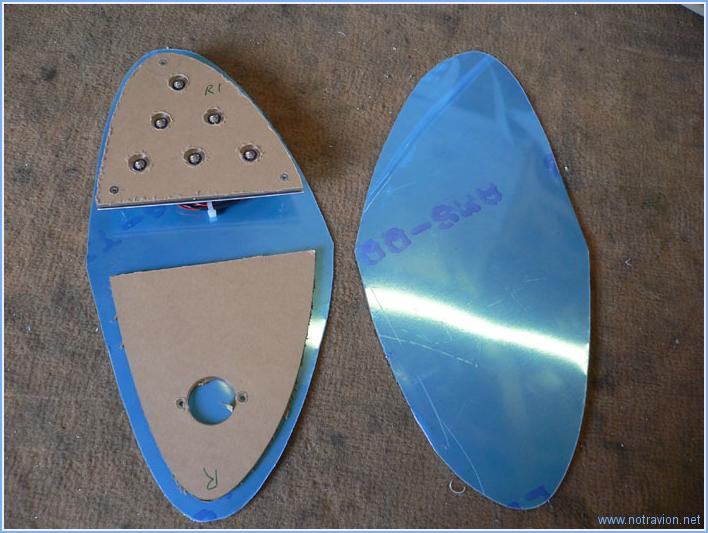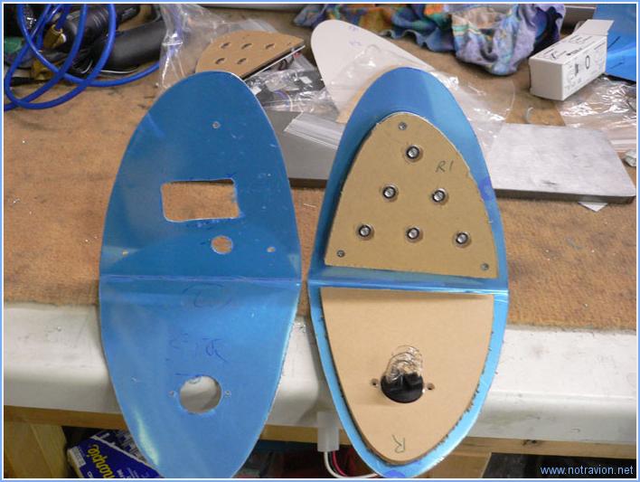 J'ai retrouvé un peu de d'aluminium de la bonne épaisseur (une peau livrée par erreur), cela a permis de continuer le travail sur les saumons. Tout d'abord, découpage d'un gabarit en carton, puis découpage dans la tôle. Ensuite, pliage et ajustement au saumon. Ensuite il faut faire les perçages pour la fixation du strobe, ainsi que pour le support des LED. Sur ce dernier il y a des protubérances à l'arrière : le support du fil d'alimentation et un petit radiateur. Il ne reste plus qu'à percer le saumon, arranger un peu l'ouverture rectangulaire et enlever les protection bleues et beiges. Temps de travail sur le sous-ensemble Aujourd'hui : 2h (Total : 3h) |