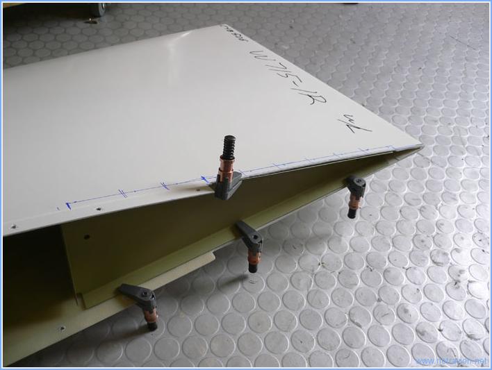 Après une semaine d'absence (cause travail), retour à l'atelier pour la suite de l'installation des saumons. Cela commence par l'installation de la petite nervure dans le bord de fuite, perçage, fraisage et rivetage sans trop de difficulté. Puis comme j'ai choisi de fixer le saumon par des vis, il faut faire tous le perçages, les fraisages et le rivetage des écrous prisonniers. Il y a 38 écrous, donc 114 perçages (3 par écrous : 2 rivets et le trou central), 38 embrévages sur la tôle, 114 fraisages pour les rivets et les vis. Au total beaucoup de travail pour en arriver au résultat final suivant. La photo montre les premières vis au niveau du support de l'aileron. Et je n'ai fait que le saumons droit, demain j'attaque le gauche. Temps de travail sur le sous-ensemble Aujourd'hui : 3h (Total : 15h) |