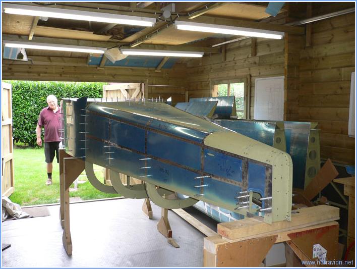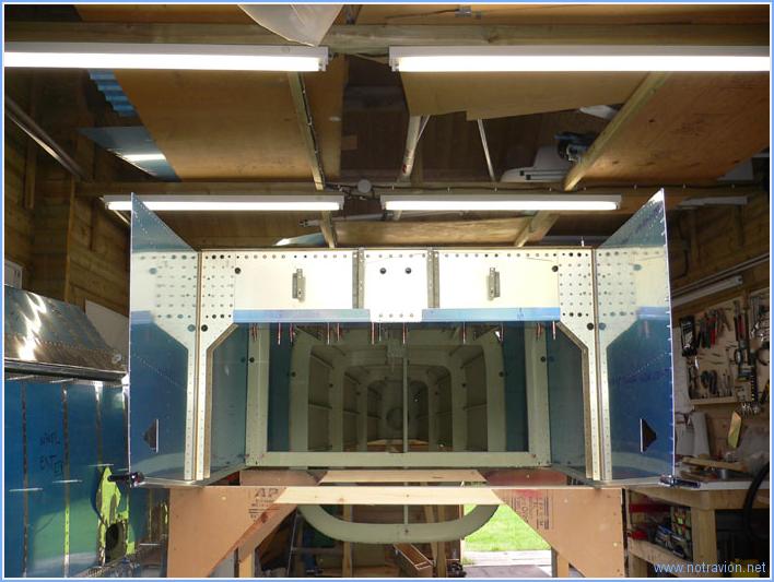 La construction de la partie avant du fuselage commence par l'assemblage de la partie arrière, de la partie centrale et des longerons. Cette opération se fait avec toutes les parties retournées sur des tréteaux, ensuite il faut mettre en place les peaux latérales avant. Après une petite frayeur sur la coupe des longerons tout est rentré dans l'ordre et les peaux sont bien en place. Voici le résultat. Temps de travail sur le sous-ensemble Aujourd'hui : 1h (Total : 1h) |