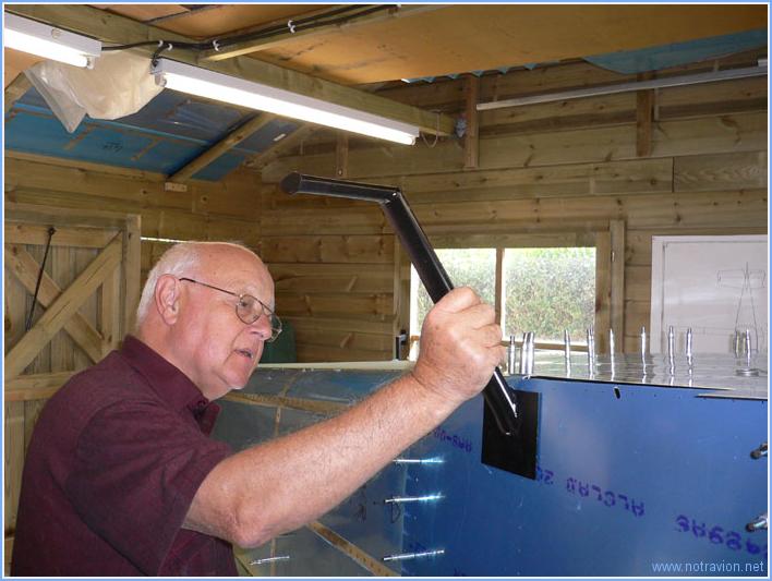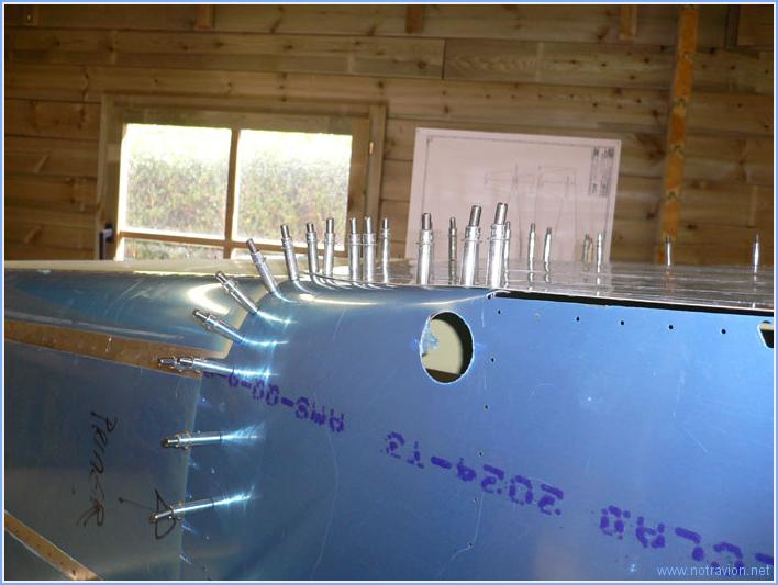 La peau latérale avant doit être percée pour permettre l'installation du marchepied, cela se fait sans problème au trépan. Ensuite il y a un petit morceau de peau à plier pour se conformer à l'arrondi du fuselage central. La méthode est très détaillée dans le manuel et elle fonctionne (j'ai oublié de prendre une photo du montage à faire), et voici les résultat. Il est normal qu'il y ait un espace entre les tôles, il manque une nervure à l'intérieur du fuselage. On remarque aussi que la partie avant du pliage doit être encore un peu ajustée. Pour finir, nous avons mis en place à l'essai un des marchepieds. Temps de travail sur le sous-ensemble Aujourd'hui : 2h (Total : 3h) |