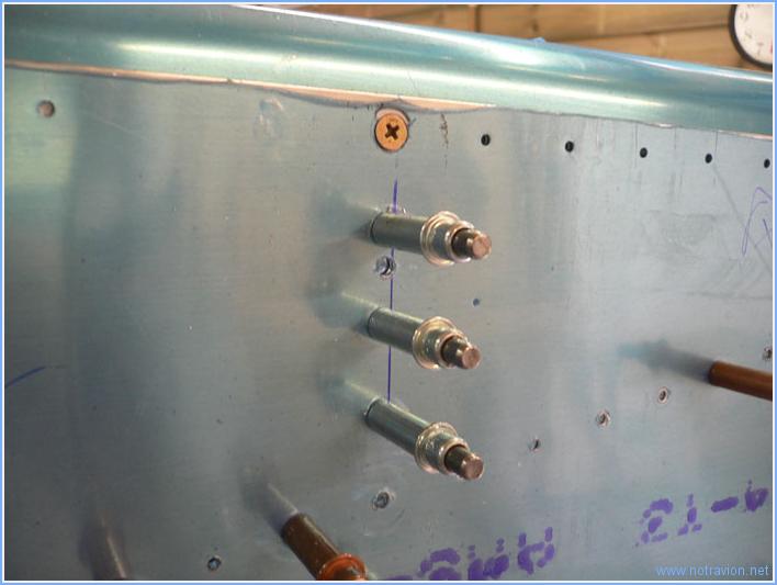 la journée commence par l'installation du cadre avant, en fait il s'agit seulement de mettre en place verticalement de chaque coté un raidisseur. Il a fallu gauffrer un peu la partie venant en contact avec la peau et reprendre un peu le pliage de la lanqguette supérieure. Ensuite se met en place une une plaque d'aluminium assez conséquente qui vient renforcer la peau à l'endroit o๠le support du train d'atterrissage viendra se fixer. On voit cette plaque à gauche sur la photo avec l'étiquette blanche. Ensuite commence la préparation et l'installation des pièces qui vont permettre de fixer les réservoirs au fuselage. Les ailes sont fixées au fuselage en trois points : le longeron principal dans le cadre principal, le longeron arrière dans le cadre des sièges et les réservoirs sur une équerre fixées au niveau du cadre avant. Cette équerre est fixée à travers la peau sur un morceau de cornière qu'il faut découper, il faut aussi fabriquer deux cales à insérer entre cette pièce et la peau. Voici les pièces du coté droit. Enfin, la cornière est mise en place, percée en plusieurs étapes pour recevoir les boulons et rivets de fixations. Sur la photo on voit le boulon de fixation supérieur, les deux cales sont invisibles entre la cornière et la peau. Voici une vue de l'extérieur avec l'équerre sur laquelle viendra se fixer le réservoir. Enfin, j'ai remis en place la peau inférieure avant pour le perçage inférieur de la cornière et le fraisage de l'ensemble pour permettre la mise en place d'une vis de fixation à tête fraisée. La vis est assez grande et le fraisage dépasse l'épaisseur de la peau, mais c'est prévu comme cela. Temps de travail sur le sous-ensemble Aujourd'hui : 5h (Total : 22h) |