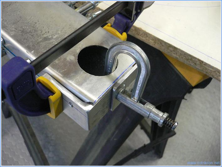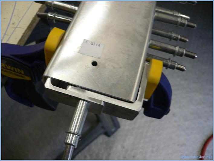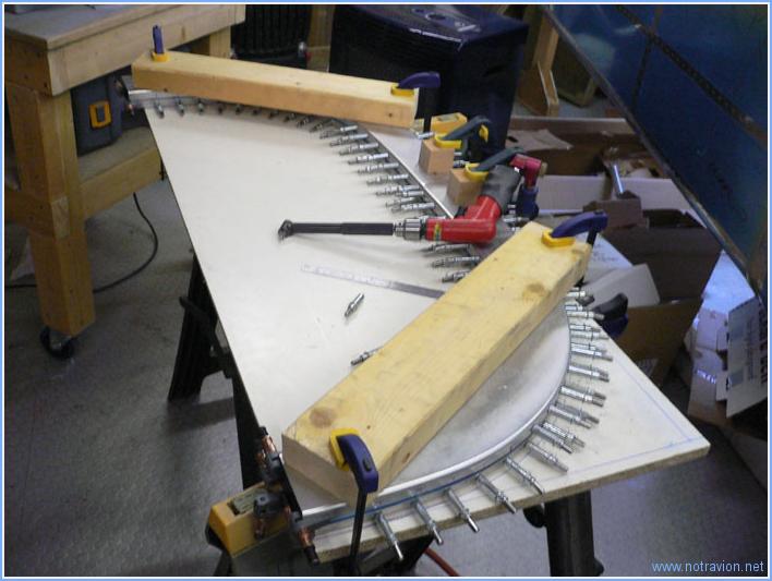 Aujourd'hui, suite de l'assemblage de l'arceau. Cela commence par la mise en place et le perçage des deux demi-parties avant. Ensuite il s'agit de mettre en place les deux angles fabriqués il y a deux jours. Leur positionnement est assez vague sur les plans. Dans un premier temps il faut découper le bas de la partie extérieure de l'arceau pour que le gros angle soit bien positionné, ensuite on perce en position les deux angles pour les riveter ensemble et permettre de travailler avec un montage rigide. Ce rivetage n'est pas structurel, il s'agit juste d'un maintien. Voici la photo après perçage, avec les pinces en place. Et maintenant il faut positionner ces angles sur le fuselage, au niveau du cadre des sièges avec là encore une cote sur le plan qui est quasiment non mesurable sur l'avion, mais on verra cela la prochaine fois. Temps de travail sur le sous-ensemble Aujourd'hui : 3h (Total : 62h) |