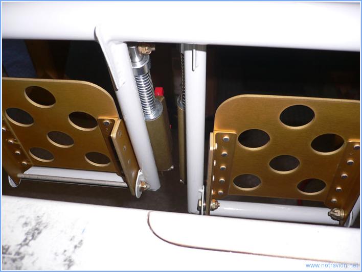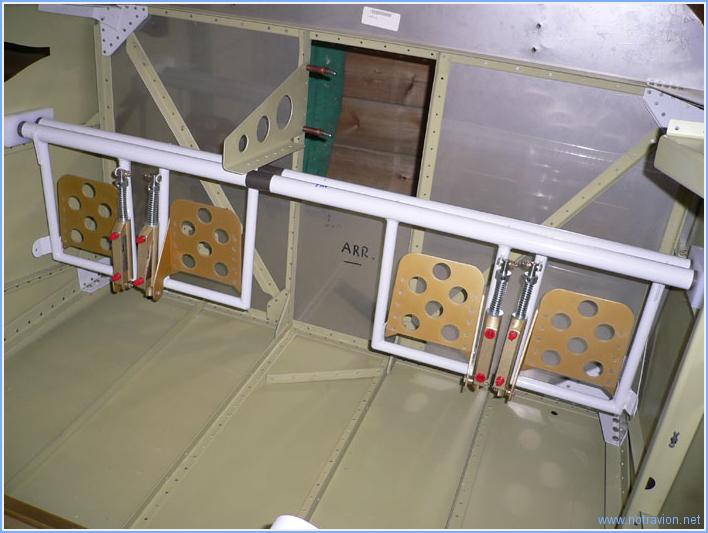 Suite du montage des freins. Mise en place des maitres cylindres sur toutes les pédales. La fixation des pédales se fait normalement par deux boulons comme à droite sur la photo. Pour éviter des efforts en torsion et faciliter le mouvement des pédales, j'installe un long boulon par pédale comme à gauche. Voici ce que cela donne avec l'ensemble en place dans le fuselage. Temps de travail sur le sous-ensemble Aujourd'hui : 2h (Total : 106h) |