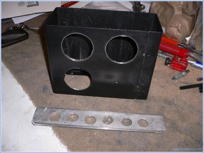 Comme je ne peux pas continuer à travailler dans la cabine, je commence à m'intéresser à ce qui s'installe sous les capots moteur. je commence par le support de la batterie. Il s'agit d'un boite en acier qu'on peut alléger un peu en perçant huit trous, quatre sur la face avant et quatre sur la face arrière. Voici la boite après trois perçages. A l'avant une barre métallique qui permettra de maintenir la batterie dans la boite (le non alignement des trous intérieurs de la barre est ma touche personnelle du jour!!!!!) Et voici ce que cela donne avec tous les perçages terminés, et les angles latéraux de fixation percés. Temps de travail sur le sous-ensemble Aujourd'hui : 2h (Total : 2h) |
