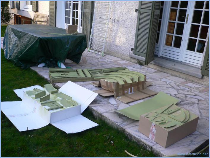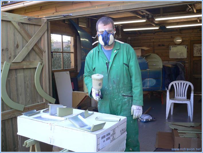 Une belle journée avec des températures acceptables pour passer toutes les pièces en attente au primaire. Tout d'abord toutes les pièces sont dégraissées, ensuite déguisement en petit homme vert pour la peinture. Voici une partie des pièces qui sèchent au soleil sur la terrasse. J'ai eu de la chance de pouvoir terminer car mon compresseur a décidé en fin d'après midi de ne plus compresser au dessus de 2 bars. C'est la pression minimale pour terminer mes pièces, maintenant il reste à dépanner le compresseur. Temps de travail sur le sous-ensemble Aujourd'hui : 5h (Total : 132h) |