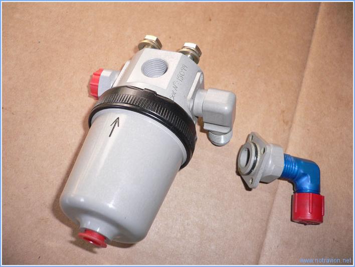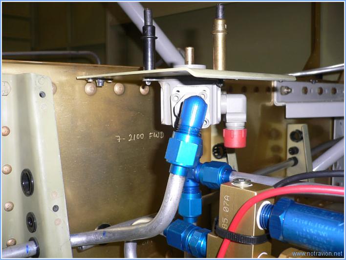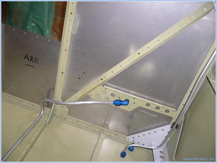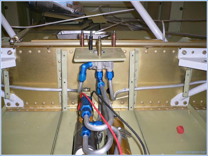 Suite de l'installation des conduites de carburant. Tout d'abord, j'ai trouvé une solution élégante à mon petit problème d'interférence qui me tracassait encore un peu. En fait j'ai besoin d'une sortie coudée sur le filtre-décanteur, j'ai donc prélevé sur le filtre une sortie filetée pour y installer un coude et installé sur le filtre une sortie coudée prélevée sur le robinet carburant. En installant le raccord droit avec le coude sur le robinet carburant, il est possible de positionner le coude dans une position permettant de passer à coté du tuyau gênant. Voici la vue des pièces montées sur le robinet carburant. Une image du robinet carburant et de la pompe. La conduite carburant venant de la pompe et traversant la cloison pare-feu vers le filtre décanteur. Je n'ai pas travaillé sur les traversées du fuselage, car je vais en fait refabriquer toutes les conduites carburant et freins. La mise en place nécessite pas mal de petits essais, les conduites sont triturées dans tous les sens et l'aluminium à tendance à durcir et à devenir friable dans ces opérations. Le prix à payer pour avoir la tranquilité est assez faible (25$ pour tout remplacer). Temps de travail sur le sous-ensemble Aujourd'hui : 2h (Total : 137h) |