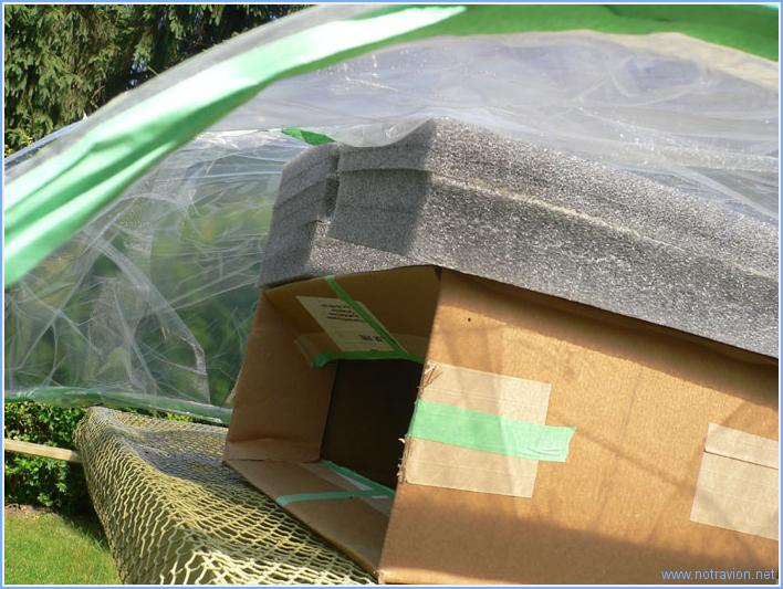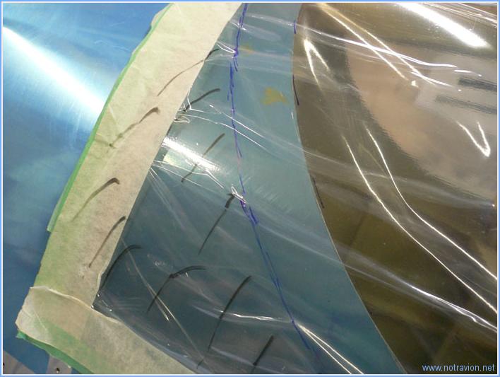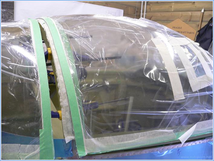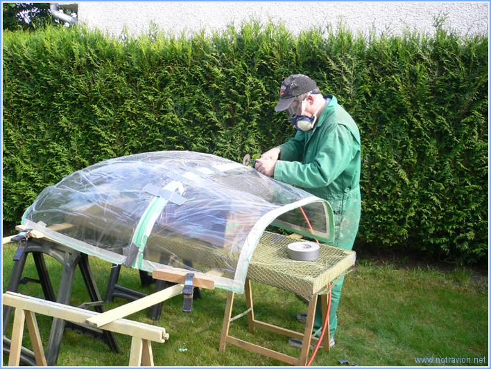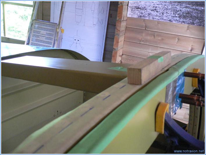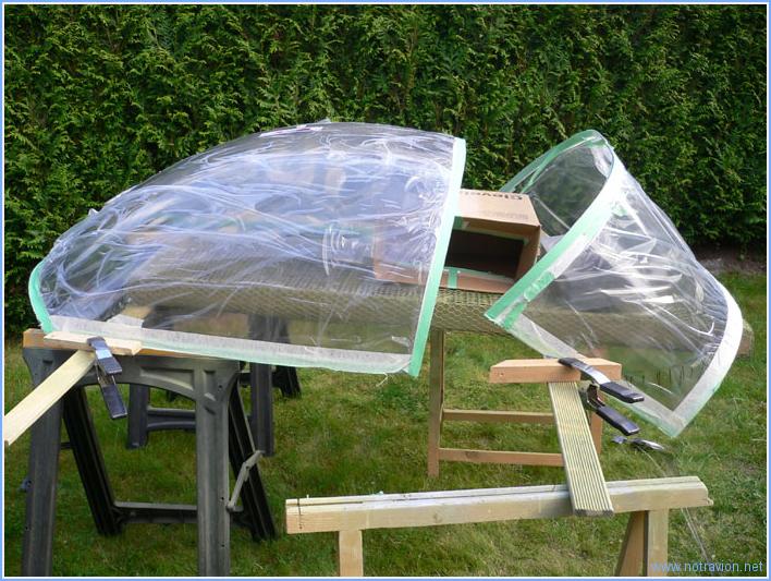 La journée commence par la suite du travail sur la verrière. Après avoir installé la verrière dans le jardin, je refais la protection de l'arceau, en marque le milieu pour la découpe et installe une cale de 20mm. Quand la verrière touchera cette cale, elle sera prête à être coupée en deux. Voici l'avant de la verrière après la première coupe, il faut en couper encore peu pour obtenir un meilleur ajustement. Avant cela, le hublot arrière est marqué pour permettre la découpe ultérieure. La ligne actuelle est tracée de façon très conservative. Voici le deux chutes découpées à l'avant de la verrière. Elle est maintenant correctement positionnée pour tracer la ligne de coupe. Après une énième installation sur le fuselage, la ligne de coupe est marquée avec deux bandes d'adhésif. J'en rajoute plusieurs couches pour créer un petit sillon qui permettra de guider le disque de coupe. Voici le montage utilisé pour maintenir la verrière lors de la coupe et éviter que les deux pièces ne se cassent en tombant en fin de découpe. Cela a très bien fonctionné. Voici le moment crucial de la coupe. J'ai commencé par faire un passage peu profond sur toute la longueur, puis j'ai finalisé la coupe des deux cotés avant de terminer par la partie centrale. Chaque fois qu'une petite longueur est complètement coupée, les deux parties sont maintenues par de l'adhésif costaud. Et voilà le résultat après dix minutes de travail. Après ponçage des lignes de coupe, les deux parties sont réinstallées sur le fuselage. Il semble que pour l'instant il n'y ait pas de problème majeur. La prochaine opération consistera à ajuster la partie avant sur le cadre. Temps de travail sur le sous-ensemble Aujourd'hui : 3h (Total : 74h) |