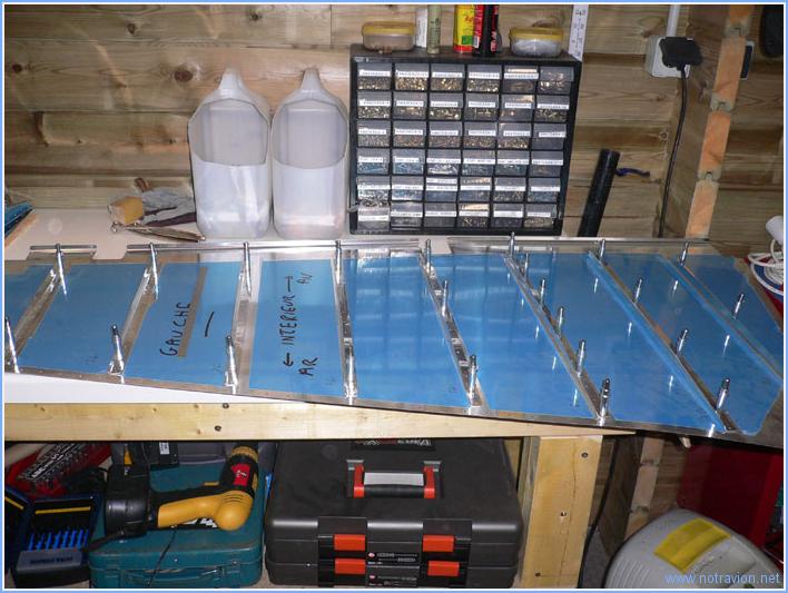 Début du travail sur la gouverne de direction. La construction commence par les raidisseurs, il y en a huit par coté. Chaque raidisseur doit être coupé à la bonne longueur, puis il y a deux découpes à faire notamment pour prendre en compte le rétrécissement vers le bord de fuite. Ensuite toutes les coupes sont adoucies avant le perçage une fois positionné sur la peau. Pour finir, début du montage du squelette, avec fabrication de quelques pièces à partir de feuilles d'aluminium brut. Temps de travail sur le sous-ensemble Aujourd'hui : 4h (Total : 4h) |