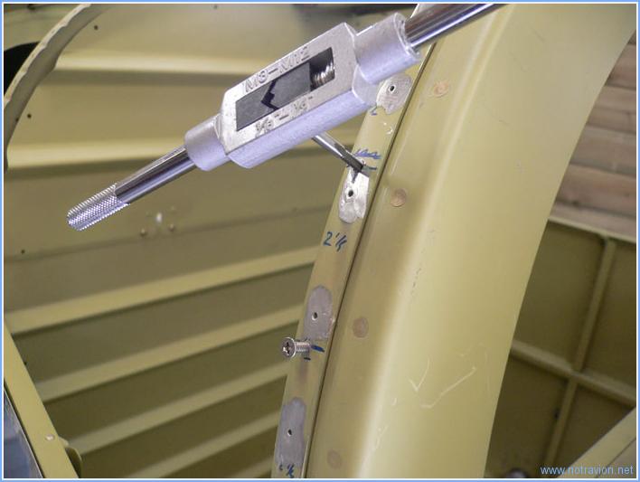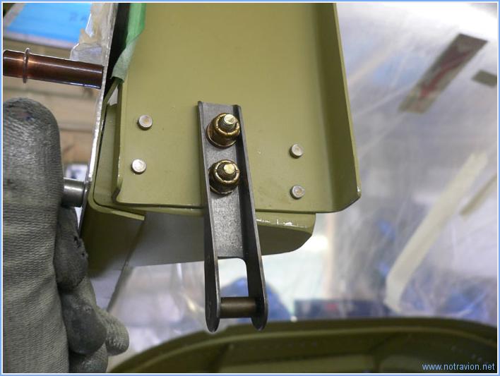 L'après-midi d'aujourd'hui est consacrée à divers petits travaux sur le hublot et la verrière. Tout d'abord le hublot arrière est démonté et la peau arrière percée. Premier problème, au moment de faire les embrèvements, je m'aperçois que j'ai fait les perçages à un diamètre trop grand, il va falloir passer a un diamètre supérieur pour les vis (modification approuvée par Van's). Ensuite, les perçages sur l'arceau dont taraudés l'opération est assez longue vu le nombre de perçages. Puis j'ai fabriqué quatre bandes d'aluminium sur lesquelles les vis de fixation arrière du hublot vont s'appuyer, cela permet de répartir un peu plus les contraintes au niveau de vis de fixation. Ensuite avec l'aide de Sabine, nous avons mis en place les anneaux de verrouillage arrière de la verrière. L'opération nécessite de travailler en partie depuis l'intérieur de la cabine avec la verrière fermée. Il a fallu plusieurs ajustements pour obtenir un placement correct de chaque coté. Voici un des coté terminé. Et voici une vue depuis l'intérieur, avec le verrou engagé dans l'oreille. J'ai également installé la poignée supérieur de verrouillage. Cette poignée permet également de maintenir la verrière entrouverte lors des roulages par temps chaud par exemple. Temps de travail sur le sous-ensemble Aujourd'hui : 4h (Total : 100h) |