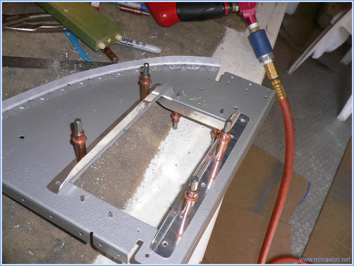 Je poursuis l'installation de la boite à gant sur le support du tableau de bord. Tout d'abord je fais la coupe tracée hier dans le fuselage. Ensuite il s'agit de renforcer la découpe dans le tableau en rivetant quatre cornières. Une fois les cornières rivetées, la pièce doit être peinte. j'en profite pour peindre la boite à gant, en voici une moitié avant assemblage. Comme le matériel de peinture est sorti, le cadre de la verrière reçoit quelques retouches et la barre de verrouillage arrière est peinte de la couleur de l'intérieur. Temps de travail sur le sous-ensemble Aujourd'hui : 3h (Total : 179h) |
