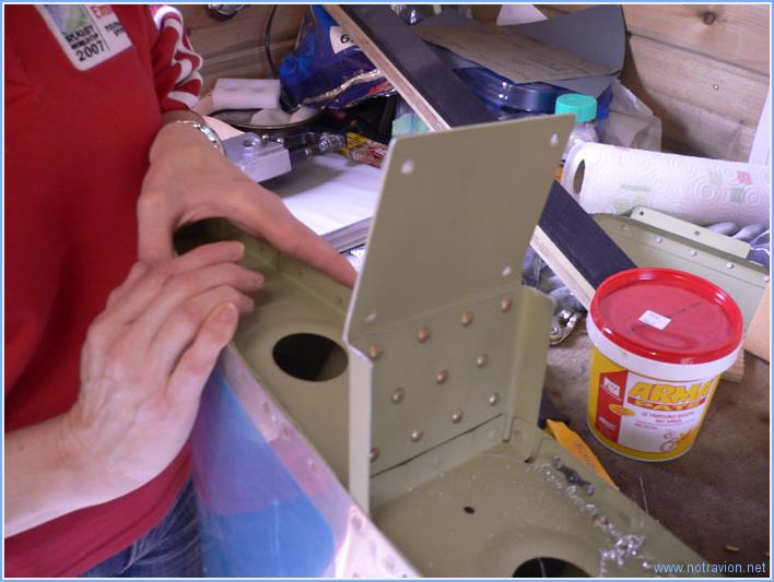 Suite du travail sur les saumons. Je commence tout d'abord par coller le long de toutes les pièces une bande de renfort en aluminium pour permettre une meilleure tenue des rivets de fixation. Ensuite pour permettre de vérifier tous les alignements et tous les jeux entre les gouvernes, je commence par réinstaller toutes les pièces sur le fuselage. Avant cela je rivète la plaque de fixation avant de la partie fixe de l'empennage vertical (pour tout dire il a fallu la faire deux fois, la première fois elle était placée du mauvais coté). Et voilà tout est en place. Temps de travail sur le sous-ensemble Aujourd'hui : 3h (Total : 12h) |