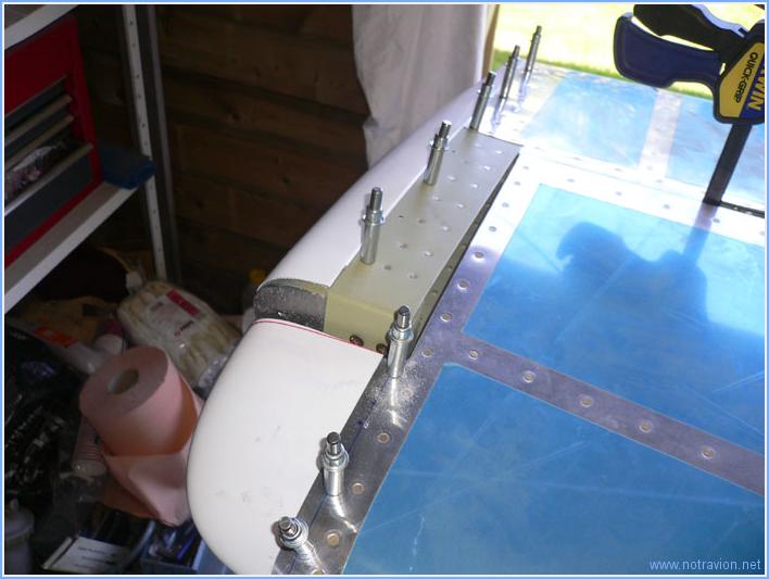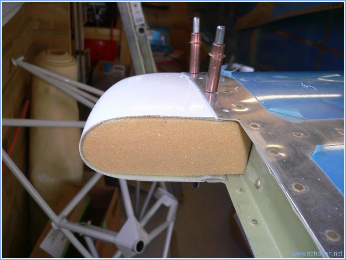 Une petite partie de la matinée est consacrée à l'ajustement et au perçage des saumons sur l'empennage horizontal. Cela parait assez trivial, mais il y a pas mal d'opérations avec les perçages, fraisages du saumon et embrévage de l'aluminium. Puis, fabrication dans une plaque de mousse légère des pièces permettant d'obturer les saumons.. Les renforts en aluminium posés hier s'étant détachés lors du perçage, il a fallu les recoller (il vaut mieux faire les perçages dans la fibre de verre en premier, puis percer les renforts, puis coller les renforts). J'ai également collé les petits pièces de mousse. Et à droite, j'ai fait une petite réparation sur le carénage de l'empennage (les morceaux de tissu pelable blanc). Temps de travail sur le sous-ensemble Aujourd'hui : 4h (Total : 16h) |