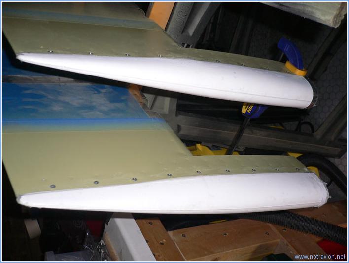 Je commence par l'installation des saumons sur les deux demi-gouvernes de profondeur. Je dessine également grossièrement le contour avant du saumon, autour du contrepoids. Puis j'installe une bande de fibre de verre en renfort entre les saumons et la structure. Sur la photo, le plan fixe vertical. J'utilise la technique décrite ICI. Cela fonctionne très bien, permet de garder un minimum de propreté, de transporter les bandes de fibre à l'autre bout de l'atelier si nécessaire. Tout n'est pas encore terminé, la suite demain. Temps de travail sur le sous-ensemble Aujourd'hui : 3h (Total : 21h) |