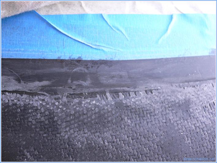 Le ponçage commence sur la verrière. Tout d'abord sur l'avant du raccordement pour arriver jusqu'à l'endroit o๠le collage sur la tôle est correct. Sur la photo on devine la position initiale (le trait rouge à gauche). Ensuite je m'occupe de la partie supérieure, à certains endroit la fibre de verre ne touche pas l'adhésif de marquage, il faudra faire un peu de remplissage avant de continuer. Je fait tout de suite un masticage du congé de raccordement pour effacer les petits défauts. Je pense que je poserais par dessus un tissu de fibre de verre léger. Temps de travail sur le sous-ensemble Aujourd'hui : 2h (Total : 114h) |