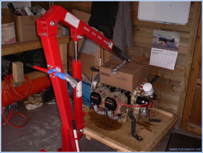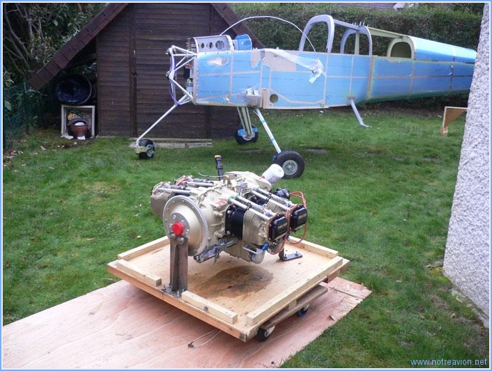 J'ai profité de la visite de mes parents pour déménager le moteur depuis le garage de mon voisin vers l'atelier. Voici le moteur monté sur deux petits plateaux à roulette, sur la gauche la palette sur laquelle il a été livré et au fond l'épais carton formant la boite. La rencontre dans le jardin entre le moteur et le fuselage. Et voici le moteur installé dans l'atelier. La chèvre a permis de retirer les plateaux à roulettes. Le moteur sera séparé de son support juste avant l'installation sur l'avion. Voici une vue de l'arrière du moteur. On y trouve dans le sens horaire en partant du haut : le filtre à huile en blanc, l'emplacement pour la pompe à vide ou un alternateur de secours en noir, l'allumage électronique PMag, l'emplacement pour le régulateur d'hélice (avec le cache doré), la pompe à essence en forma de cône, et la magnéto traditionnelle avec les fils de bougie. Voici une vue de l'avant, avec le couronne du démarreur. On note qu'il y a bien un bouchon au centre de la couronne puisque le moteur fra tourner une hélice à pas fixe bien que pouvant être équipé d'un pas variable, auquel cas l'huile de régulation doit pouvoir passer par le centre pour atteindre le moyeu. Temps de travail sur le sous-ensemble Aujourd'hui : 1h (Total : 1h) |