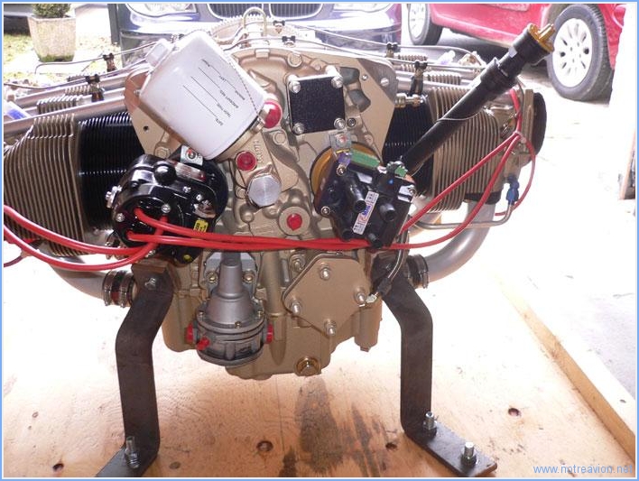 As my parents are visiting, I took the opportunity to move the engine from my neighbour's garage to the workshop. The picture shows the engine on two dollies, on the left the pallet on which the engine was delivered and in the back the thick cardboard box. The garden encounter of the engine and of the fuselage. And the engine in the workshop, with the hoist we used to remove the dollies. The engine will get of the supports only before engine hanging. Here a rear view of the engine with clockwise from the top : the white oil filter, the vacuum pump or standby alternator pad in black, the Pmag electronic ignition, the propeller governor pad with the gold cover, the fuel pump (conical) and the standard mag with the ignition wires. Here a view from the front with the starter ring gear. The plug is in place at the center as the engine is built for a constant speed propeller but I will you a use fixed-pitch. Working time on this subpart Today : 1h (Total : 1h) |