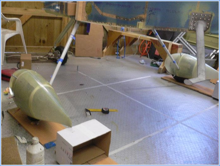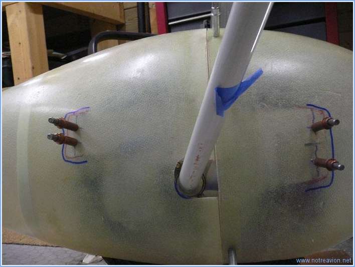 Avant de percer les carénages, il faut les positionner correctement. Cela commence par le traçage d'une ligne de référence centrale sous le fuselage. Deux fils à plomb, un traceur laser et un peu d'adhésif suffisent pour cette tâche. J'ai également tracé deux perpendiculaires à cette référence à proximité des roues. Puis les deux moitiés du carénages sont installées, non sans quelques ajustements au niveau des ouvertures (pneu et jambe de train). On arrive à voir sur cette photo que le carénage n'est pas perpendiculaire au sol, mais il est parallèle au pneu. L'ensemble est légèrement incliné car les roues ne touchent pas le sol sont dans la position qu'elles auront en vol. Avec les carénages installés sur les deux roues, commence la délicate opération d'alignement. Les deux carénages doivent être parallèles à la ligne centrale et à la même distance de cette ligne. Ils doivent aussi être centré sur le pneu. Enfin vient le moment du perçage. La position des supports est marquées car il faut renforcer l'intérieur du carénage au droit des support, l'épaisseur initiale étant un peu faible. J'ai également marqué la découpe à faire pour le passage du pneu. Temps de travail sur le sous-ensemble Aujourd'hui : 3h (Total : 36h) |