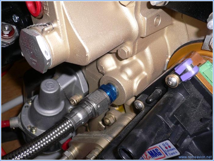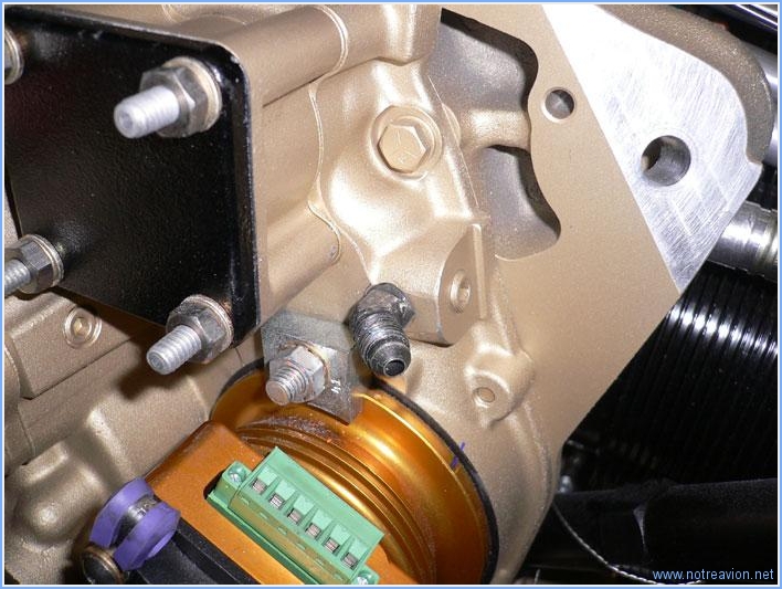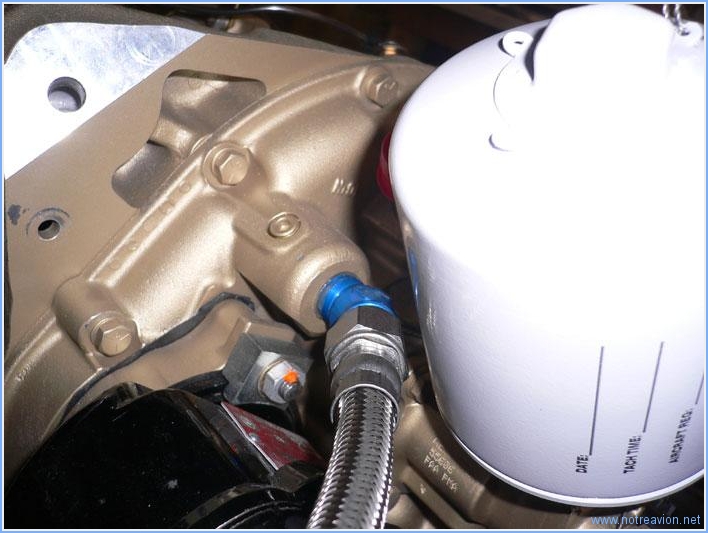 Le moment de l'accrochage du moteur approche. Il y a quelques petits travaux qui sont plus simples à faire avant cela. Tout d'abord il faut installer un raccord coudé sur la prise de pression d'huile. En fait il y a deux possibilités de branchement. Celle que j'ai choisie permetrai le cas échéant un démontage une fois le moteur accroché, mais a nécessité de desserer un des boulons de la magnéto. L'autre possibilité est juste à coté du raccord sur la photo, il faut absolument installer le raccord avant d'accrocher le moteur car ensuite le bâti moteur empêche tout accès. Puis j'installe le raccord pour la tuyauterie de retour d'huile du moteur vers le radiateur. D'après les plans, il faudrait installer un raccord coudé, mais je n'en ai qu'un seul à utiliser ailleurs. Je vais voir après installation du radiateur, s'il faut changer ce raccord. Voici l'endroit sur le moteur o๠vient se brancher la tuyauterie véhiculant l'huile refroidie depuis le radiateur vers le moteur. La prise est cachée derrière le radiateur d'huile. Il faut donc démonter le radiateur pour y avoir accès et utiliser un raccord coudé pour passer à coté du radiateur. Et voilà le résultat, le moteur est prêt à être monté. Temps de travail sur le sous-ensemble Aujourd'hui : 1h (Total : 2h) |