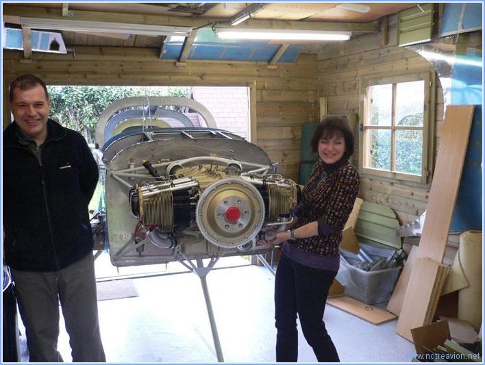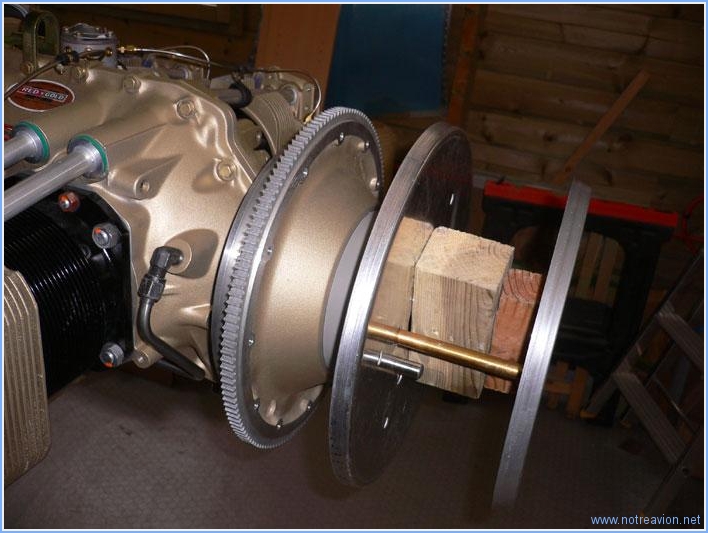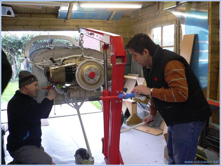Grande journée aujourd'hui, avec l'accrochage du moteur. Je commence par démonter le moteur de sa palette de transport. La photo a été prise avant que le moteur ne soit tourné pour que la chèvre soit du coté hélice et non pas du coté bâti moteur. La procédure de montage n'est pas intuitive, car le bâti est du type dynafocal, c'est à dire que les quatre boulons de fixations pointent vers le centre du moteur et que les passages des boulons ne sont alignés que lorsque les silent-block sont compressés. Une procédure précise est décrite sur le site VansAirForce, elle fonctionne parfaitement. Les deux premiers boulons du haut ont été très simple à installer. Me voici avec Jean-Pierre, un ami, en train de voir comment installer le boulon en bas à droite. Quelques petits mouvements avec la chèvre et à la main on permit d'installer ce boulon sans trop de difficulté. Pour le quatrième boulon c'est une autre histoire. Le silent-block n'est pas aligné avec le perçage du moteur. Nous essayons, avec Quentin arrivé entre temps, un certain nombre de solution : dévissage partiel des autres boulons, relevage de l'ensemble moteur fuselage sans succès. En fait la solution est simple et indiquée dans la procédure (à condition de bien comprendre ce qui est écrit). Il suffit avec un outil (tournevis, chasse-goupille ou autre), d'aligner l'ouverture du silent-block sur l'ouverture du moteur en pesant sur le caoutchouc et surtout pas sur le moteur qui n'est pas déplaçable. Après avoir passé autant de temps pour le quatrième boulon que pour tout le reste et après 1h30 d'effort, voici les travailleurs satisfaits. L'installation n'est pas terminée, mais bien avancée. Sabine est venue vérifier que tout semble solidement arrimé. Après serrage des boulons, il faut mettre en place les goupilles fendues de sécurité. Ce n'est pas une mince affaire car l'accès est quasiment impossible. Puis nous avons installé l'entretoise d'hélice, le support arrière du cône d'hélice, un morceau de bois pour simuler l'épaisseur de l'hélice et le support avant du cône. Ceci va permettre de mettre en place les capots moteur dont la position longitudinale dépend de la position du support arrière du cône. Et pour voir ce que cela donnait, voici le capot supérieur posé. Temps de travail sur le sous-ensemble Aujourd'hui : 4h (Total : 6h) |