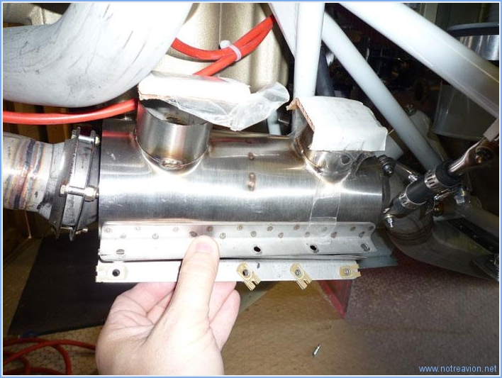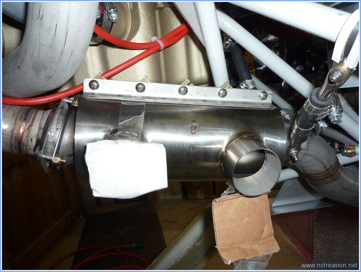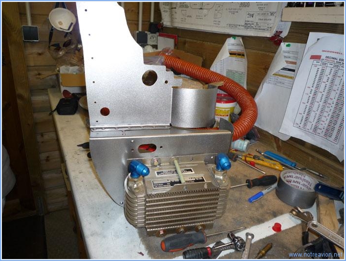 Suite du montage de l'échappement, après quelques montage et démontage du capot, le résultat semble correct c'est à dire que les écarts avec toutes le structures fixes (bâti moteur, capot, fuselage) sont corrects. Il reste à vérifier la position des manchons de support des gaines de refroidissement des silencieux. Pas de problème à droite o๠j'ai installé un morceau de gaine pour voir. Sur le coté gauche, les rampes de fixation et le support des vis de fixation interfère avec le capot et le bâti moteur. La solution est de retourner le manchon, le voici après démontage des vis. Et le voici après remontage. J'ai également installé le radiateur d'huile sur la cloison arrière. Les rondelles utilisées ont un diamètre plus grans que celle prévue et on dà» être adaptées pour permettre un montage correct. J'ai également mis en place les raccords. Temps de travail sur le sous-ensemble Aujourd'hui : 3h (Total : 89h) |