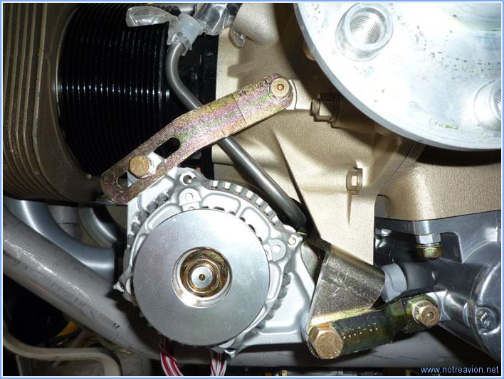 Avant d'avancer dans le montage de l'alternateur, je réinstalle le radiateur d'huile ainsi que les tuyauteries d'entrée et de sortie. La tuyauterie sortie moteur pose un problème car j'ai installé un raccord droit (à l'époque je n'avais pas de raccord coudé) et malheureusement la tuyauterie est un peu trop courte pour être installée sans contraintes excessives. Il suffit de démonter le raccord droit et d'installer un raccord coudé. C'est beaucoup plus délicat quand le moteur est déjà sur l'avion, mais on y arrive!!! Puis j'attaque quelques finitions sur le montage de l'alternateur. Serrage à la clé dynamométrique et fil freiner sur les deux boulons de fixation du support principal. Puis il y a trois autres boulons freiner : les deux de gauche et celui tout à droite. Pour celui de droite, j'ajoute un écrou sur un des goujons de fixation du démarreur. Pour les deux autres boulons, ceux-ci sont normalement freinés ensemble. L'inconvénient de ce montage est que le boulon du haut n'est quasiment jamais déserré alors que celui du bas peut l'être pour ajuster la tension de la courroie de l'alternateur. Et refaire le freinage combiné des deux boulons avec la courronne du démarreur en place risque d'être délicat. J'utilise une méthode trouvée sur un site internet, cela consiste à mettre en place deux rondelles avec des rivets pop pour pouvoir freiner indépendamment les deux boulons. Temps de travail sur le sous-ensemble Aujourd'hui : 3h (Total : 118h) |