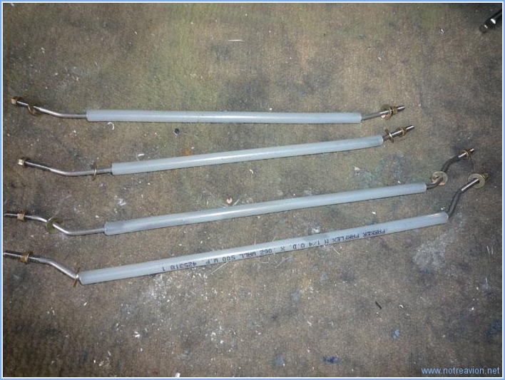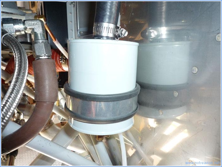 Le matériel fourni par Vans dans le kit d'équipement moteur pour l'installation du reniflard n'est pas utilisable dans ma configuration. Le montage du filtre à huile empêche l'installation de la durite coudée. Sur cette durite devrait venir se brancher une tuyauterie coudée en aluminium dont la sortie est dirigée vers la sortie inférieure du capot, soit directement ce qui risque de salir le ventre de l'avion, soit sur une des pipes d'échappement, ce qui n'a pas la faveur de certains inspecteurs du GSAC. J'ai donc fait le montage un peu différemment, en utilisant une durite souple sur toute la longueur. Voici le branchement sur le reniflard derrière le filtre à huile. Et voici la sortie, sur un bol acheté chez Aircraft Spruce car cela fait aéronautique, mais n'importe quel récipient un tant soi peu résistant ferait l'affaire. J'ai également refabriqué toutes les tringles de maintien inférieures des cloisons. Temps de travail sur le sous-ensemble Aujourd'hui : 2h (Total : 126h) |